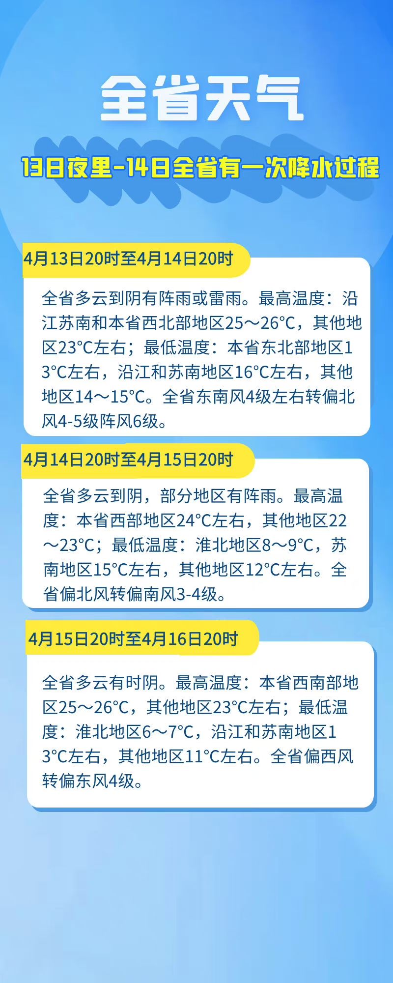 具体预报:13日夜里-14日全省有一次降水过程。4月13日20时至4月14日20时,全省多云到阴有阵雨或雷雨。最高温度:沿江苏南和本省西北部地区25~26℃,其他地区23℃左右;最低温度:本省东北部地区13℃左右,沿江和苏南地区16℃左右,其他地区14~15℃。全省东南风4级左右转偏北风4-5级阵风6级。