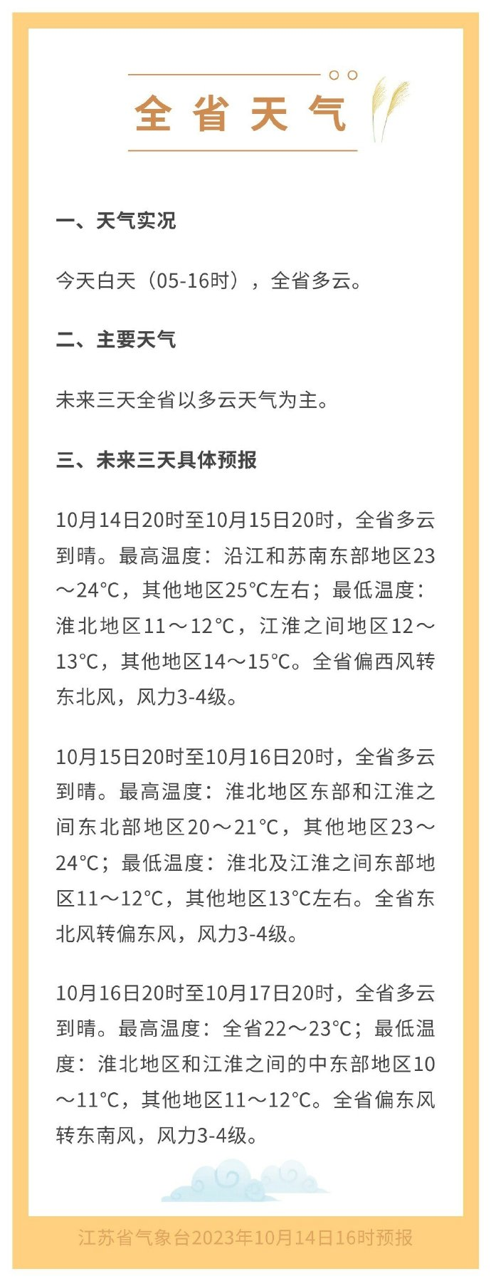 从10月14日20时至10月15日20时,江苏省全境将迎来多云到晴朗的天气。最高气温方面,沿江地区和苏南东部地区的最高气温预计在23~24℃之间,而其他地区将保持在25℃左右。夜间最低气温将有所不同,淮北地区最低气温在11~12℃之间,江淮之间地区为12~13℃,其他地区则在14~15℃之间。