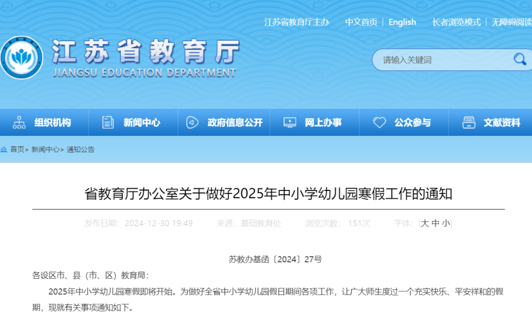 2025年中小学幼儿园寒假即将开始。为做好全省中小学幼儿园假日期间各项工作,让广大师生度过一个充实快乐、平安祥和的假期,现就有关事项通知如下——