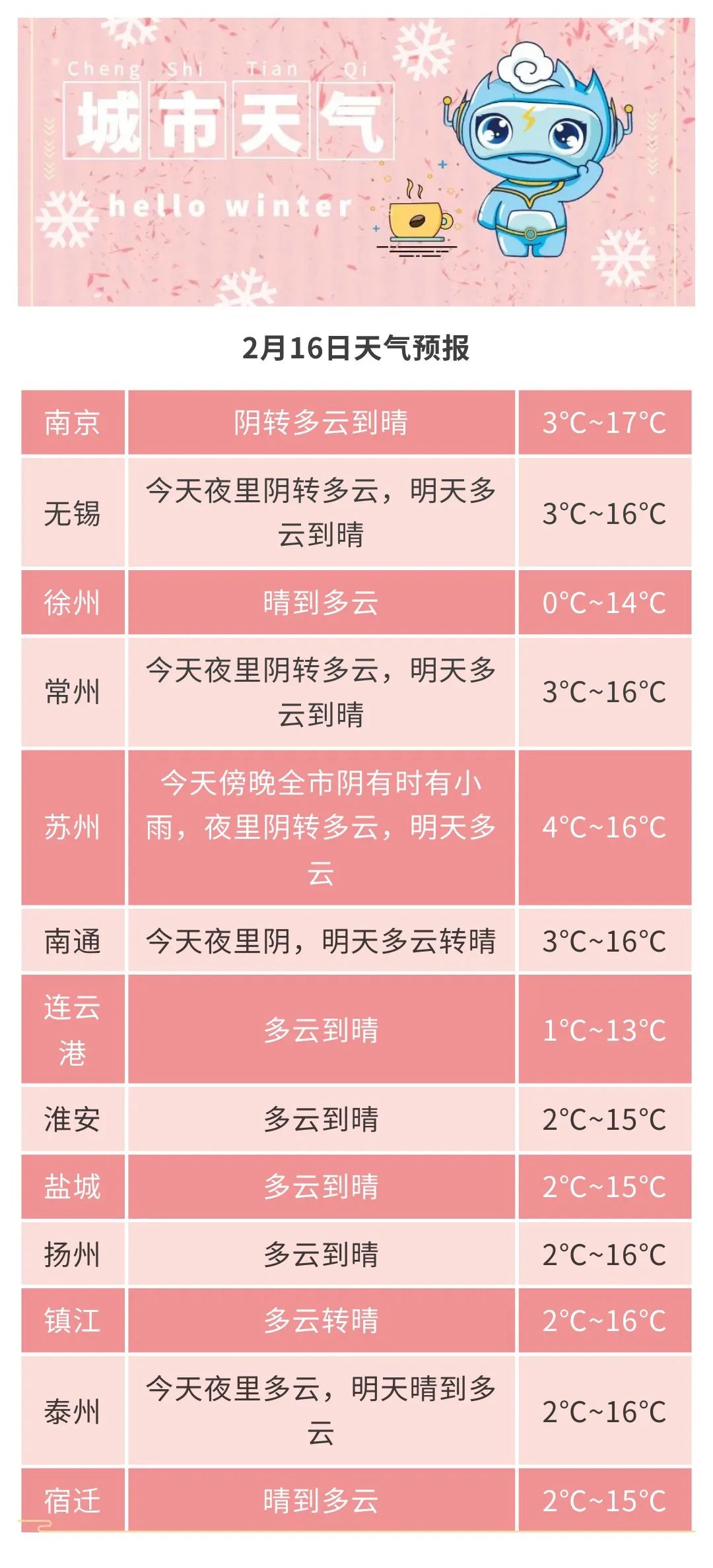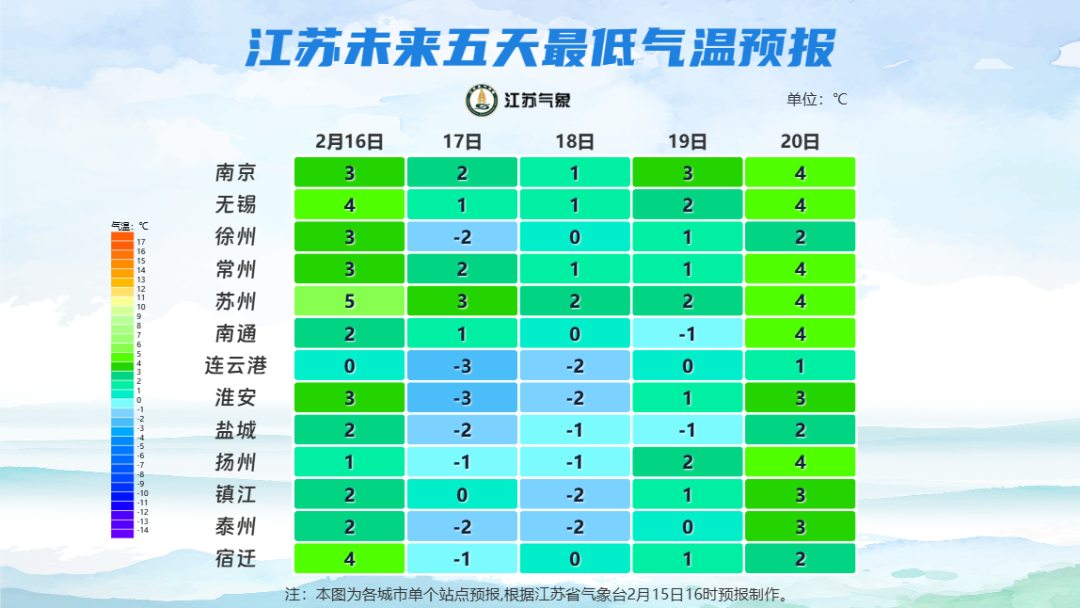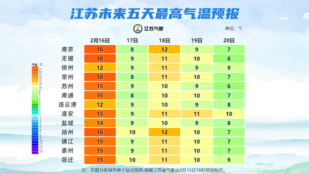 全省晴到多云。最高温度:全省10~11℃;最低温度:江淮之间北部和淮北地区-2~-3℃,苏南南部地区1℃左右,其他地区-1℃左右。全省东至东南风3-4级。