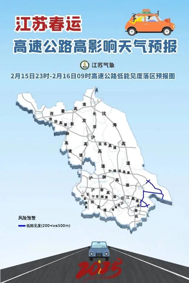 2月15日23时至2月16日09时,本省东南部局地有低能见度天气,受能见度低于500m影响的高速有:沪陕高速南通段、沿江高速等。