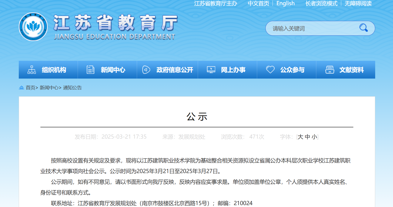 3月21日,江苏省教育厅发布公示,将以江苏建筑职业技术学院为基础整合相关资源拟设立省属公办本科层次职业学校江苏建筑职业技术大学。公示时间为2025年3月21日至2025年3月27日。