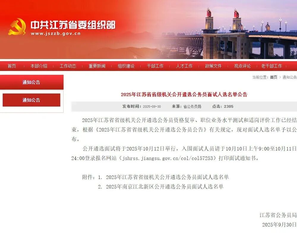 公开遴选面试将于2025年10月12日举行,入围面试人员请于10月10日上午9:00至10月11日24:00登录报名网站(jshrss.jiangsu.gov.cn/col/col57253)打印面试通知书。