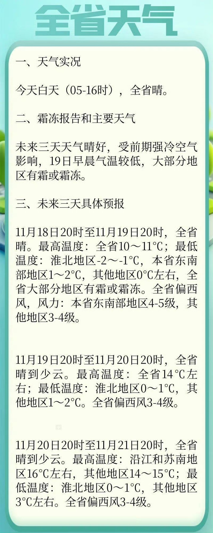 明天早晨将是此次降温的“低谷时刻”,全省大部分地区有霜或霜冻,淮北地区最低气温低至-2—-1℃,局部可达-3℃左右,东南部地区1—2℃,其他地区约0℃。早出晚归的小伙伴除了裹紧厚外套、做好防寒保暖,取暖安全更要时刻绷紧弦。不过好消息是,寒潮影响将于明天白天进入尾声,升温大幕即将拉开,明天全省最高气温就将回升至10—11℃,偏西风3—4级,东南部地区风力可达4—5级。