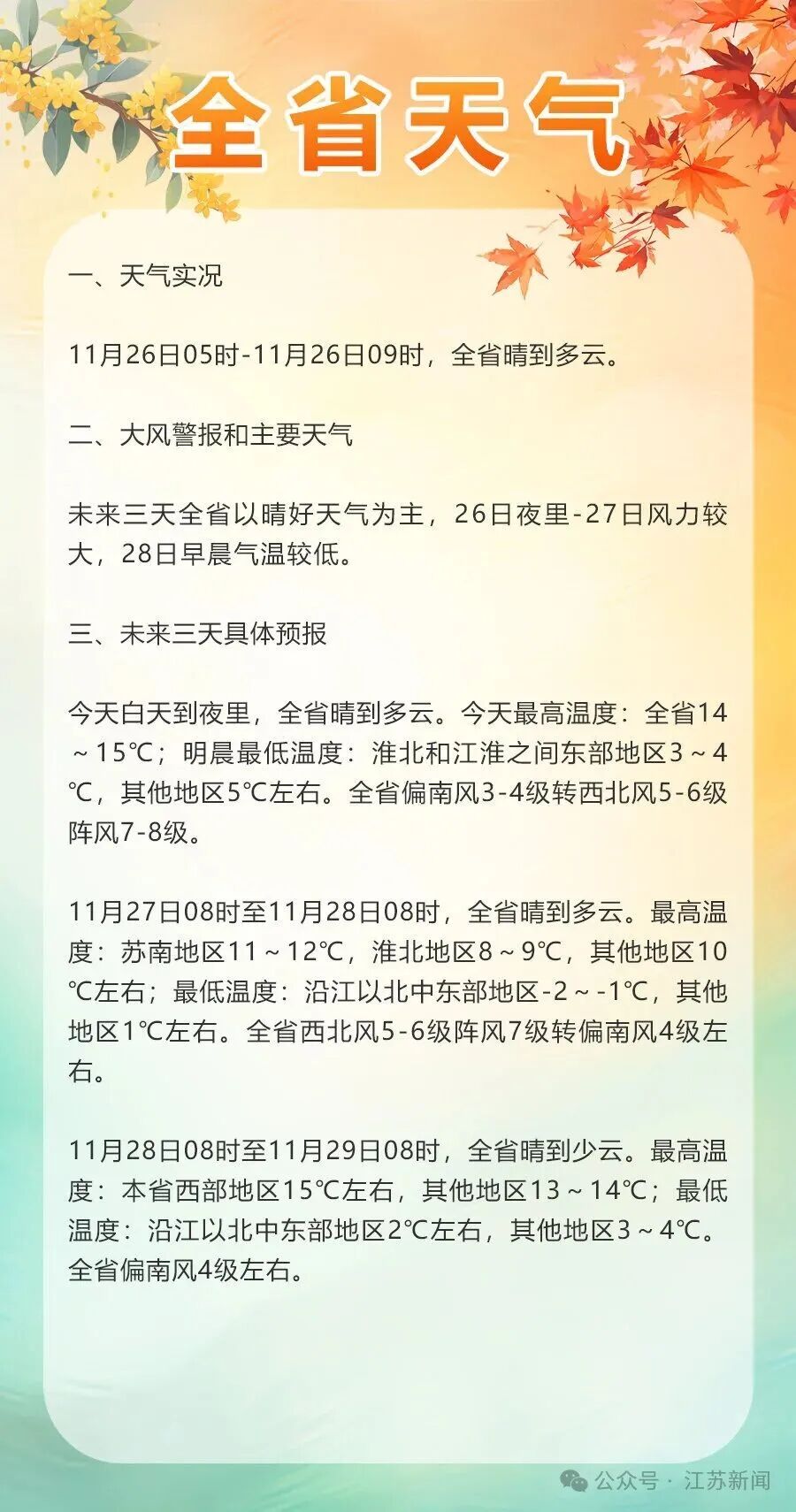 根据苏州市气象台天气预报,今天夜里多云,南风3-4级,后半夜转西北风5级,陆上最大阵风7级,水面阵风8级,对在太湖湖区航行、停泊、作业的船舶构成威胁。苏州市交通运输综合行政执法支队根据《中华人民共和国内河交通安全管理条例》《太湖水上联合搜救工作机制》决定从2025年11月26日15时00分起,对太湖进行封航,禁止船舶进入太湖湖区航行,其他涉水单位按照要求或者预案执行,封闭水域参照执行。