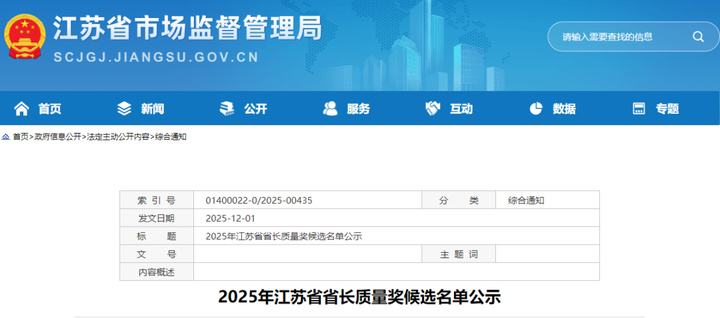 12月1日,江苏省质量发展委员会办公室发布“2025年江苏省省长质量奖候选名单公示”。