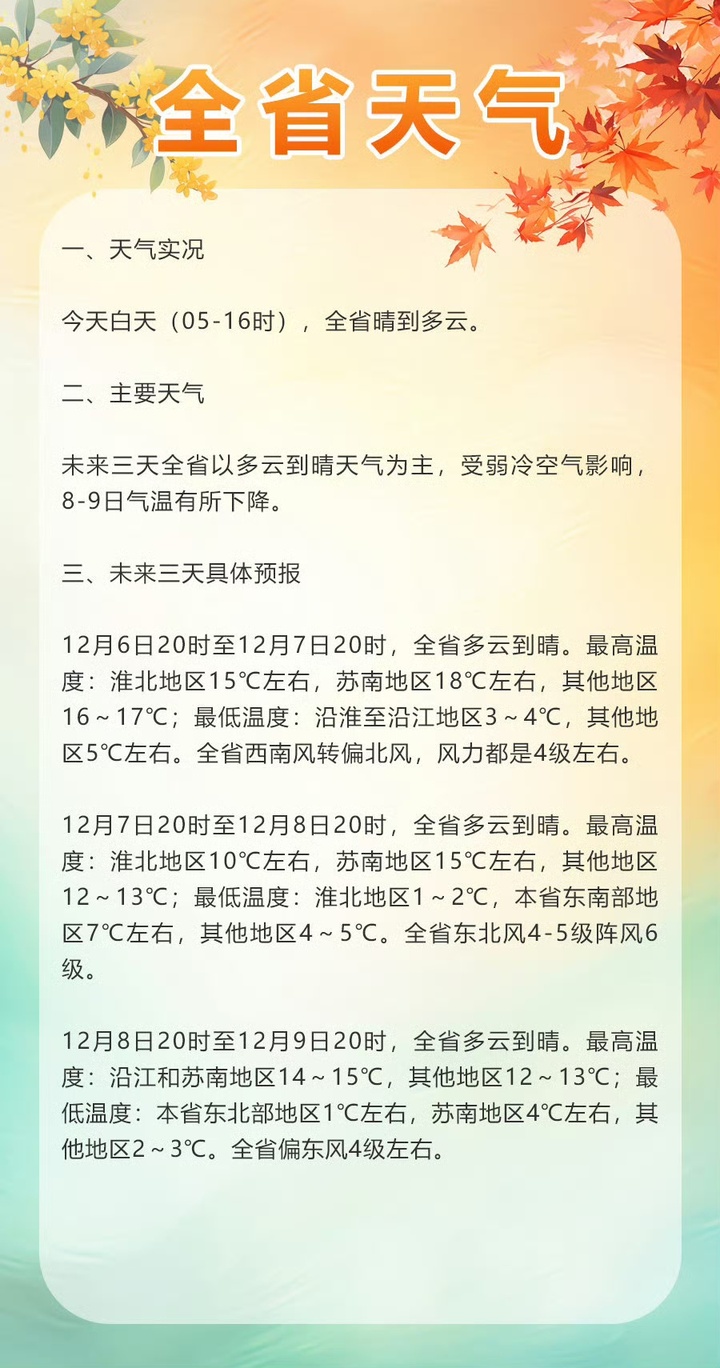 未来三天江苏以多云到晴天气为主,受弱冷空气影响,8—9日气温有所下降。12月6日20时至12月7日20时,全省多云到晴,最高温度淮北地区15℃左右,苏南地区18℃左右,其他地区16~17℃,最低温度沿淮至沿江地区3~4℃,其他地区5℃左右,全省西南风转偏北风,风力均为4级左右;12月7日20时至12月8日20时,全省多云到晴,最高温度淮北地区10℃左右,苏南地区15℃左右,其他地区12~13℃,最低温度淮北地区1~2℃,本省东南部地区7℃左右,其他地区4~5℃,全省东北风4-5级阵风6级;12月8日20时至12月9日20时,全省多云到晴,最高温度沿江和苏南地区14~15℃,其他地区12~13℃,最低温度本省东北部地区1℃左右,苏南地区4℃左右,其他地区2~3℃,全省偏东风4级左右。