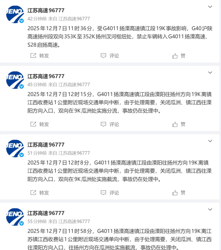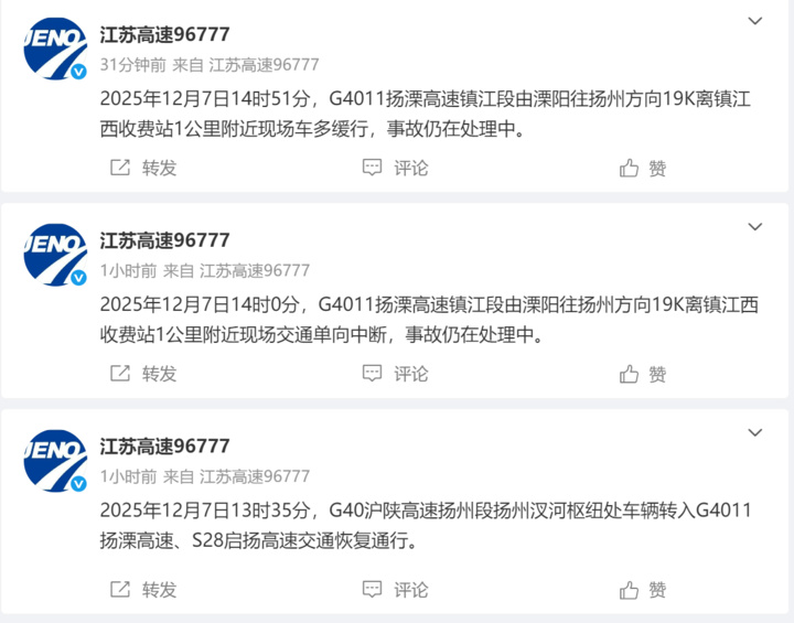 据@江苏高速96777发布的路况信息:2025年12月7日8时5分,G4011扬溧高速镇江段由溧阳往扬州方向K19+000离江苏镇江西收费站1公里附近发生1起交通事故。