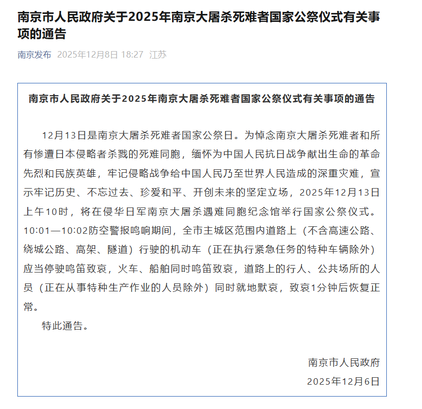 12月13日是南京大屠杀死难者国家公祭日。为悼念南京大屠杀死难者和所有惨遭日本侵略者杀戮的死难同胞,缅怀为中国人民抗日战争献出生命的革命先烈和民族英雄,牢记侵略战争给中国人民乃至世界人民造成的深重灾难,宣示牢记历史、不忘过去、珍爱和平、开创未来的坚定立场,2025年12月13日上午10时,将在侵华日军南京大屠杀遇难同胞纪念馆举行国家公祭仪式。