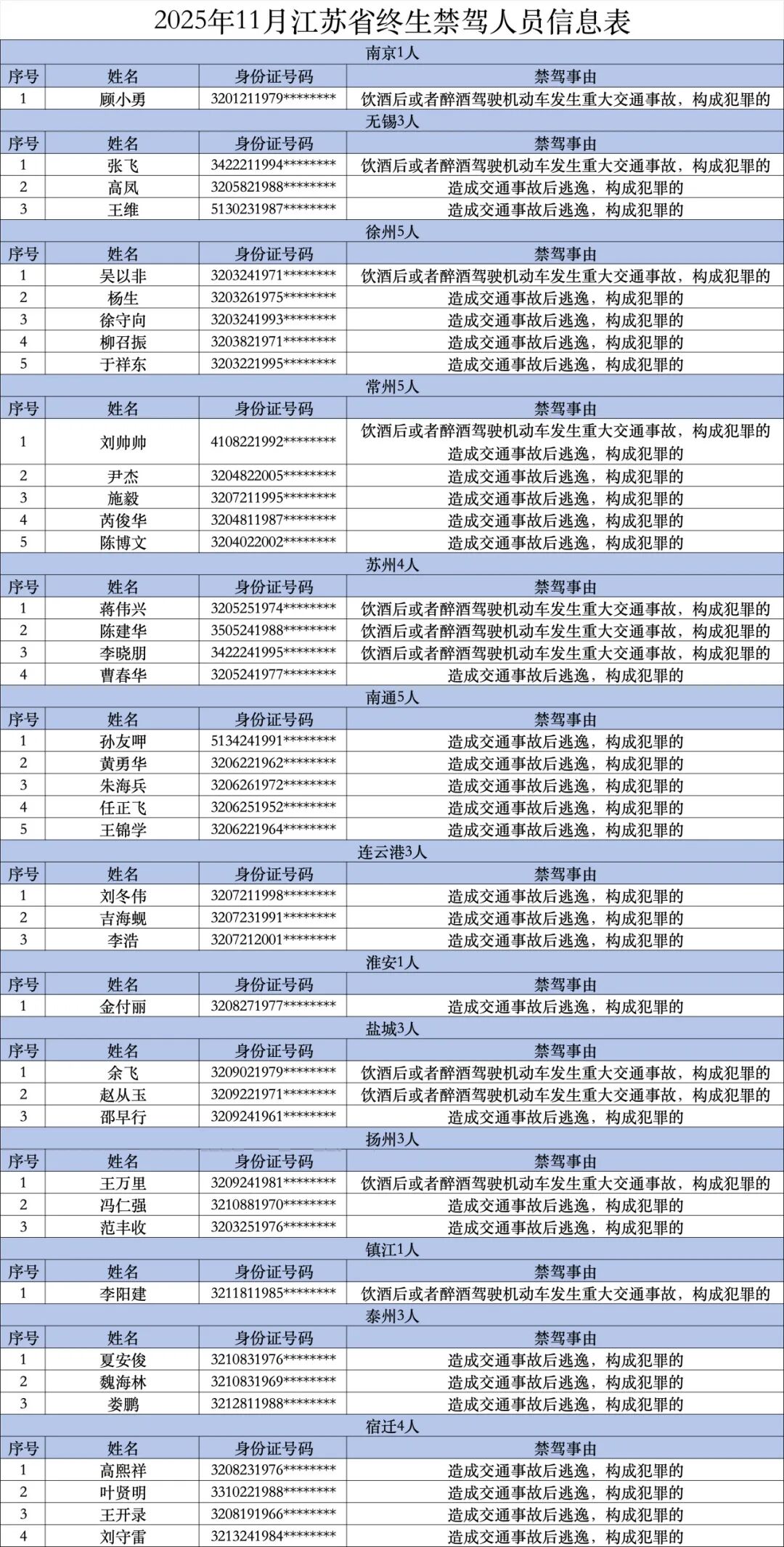 为全力以赴防风险除隐患、保安全保畅通,努力以高水平安全保障高质量发展。今年以来,江苏交警持续开展“五大曝光”行动,加大对严重交通违法犯罪行为的曝光力度,充分发挥教育引导、警示震慑作用。据统计,2025年11月,全省共计41人被依法吊销机动车驾驶证,且终生不得重新申领。现将名单予以曝光。
