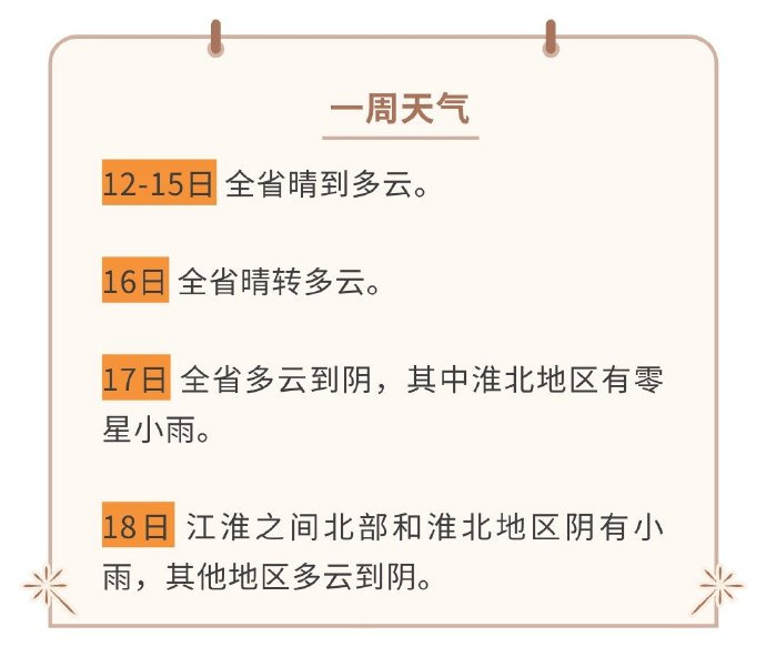具体天气预报如下:12-15日,全省晴到多云;16日,全省晴转多云;17日,全省多云到阴,其中淮北地区有零星小雨;18日,江淮之间北部和淮北地区阴有小雨,其他地区多云到阴。