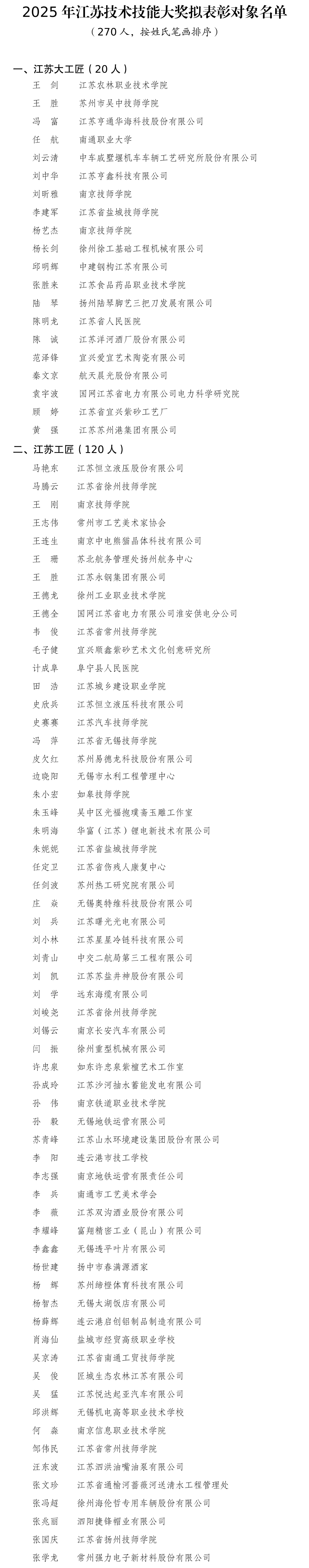 根据2025年江苏技术技能大奖评选表彰工作有关要求,按照自下而上、逐级审核推荐、差额评选、民主择优的方式,已完成资格审核、两次公示、专家评选、征求意见、全覆盖考察、相关会议审议等程序,报经省委、省政府同意,现将270名江苏技术技能大奖拟表彰对象予以公示(见附件)。如有异议,请在公示期内通过书面方式向我厅反映。
