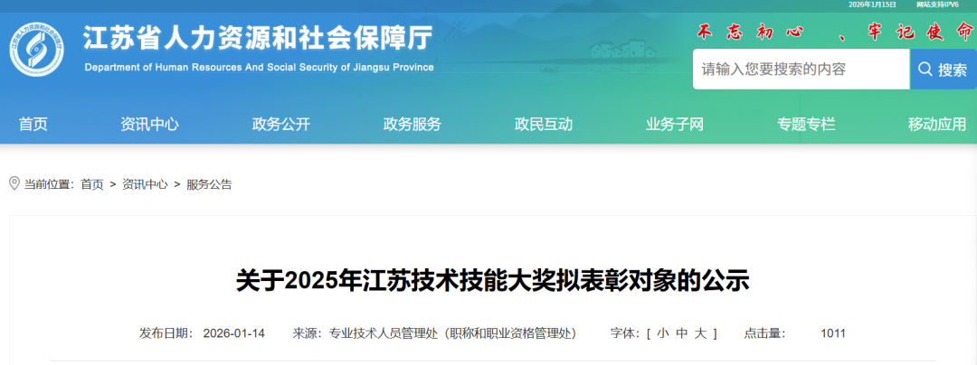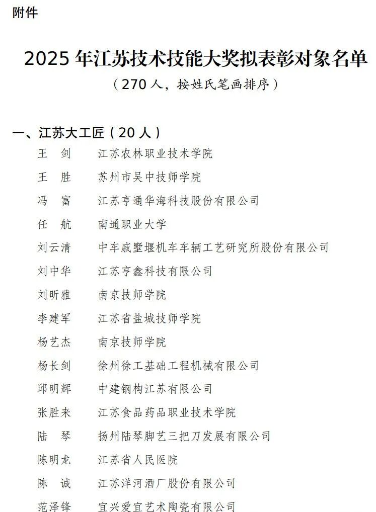 根据2025年江苏技术技能大奖评选表彰工作有关要求,按照自下而上、逐级审核推荐、差额评选、民主择优的方式,已完成资格审核、两次公示、专家评选、征求意见、全覆盖考察、相关会议审议等程序,报经省委、省政府同意,现将270名江苏技术技能大奖拟表彰对象予以公示。如有异议,请在公示期内通过书面方式向我厅反映。公示时间:2026年1月15日至1月21日。联系电话:025-83236098,83338129。