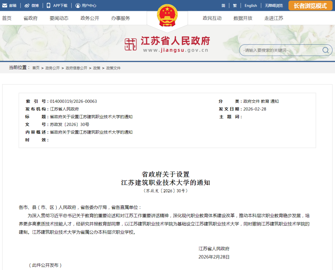 近日,江苏省人民政府发布《关于设置江苏建筑职业技术大学的通知》。