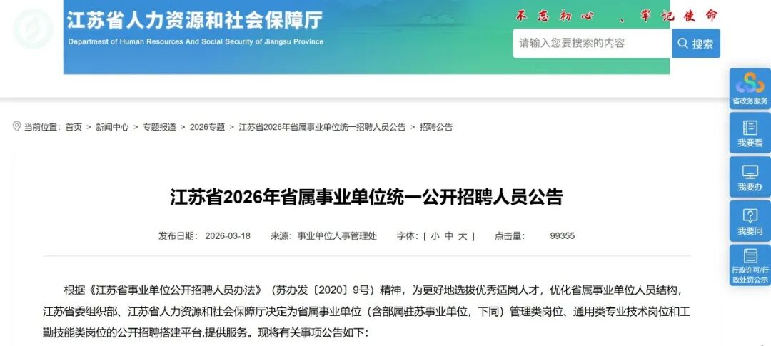 根据《江苏省事业单位公开招聘人员办法》(苏办发〔2020〕9号)精神,为更好地选拔优秀适岗人才,优化省属事业单位人员结构,江苏省委组织部、江苏省人力资源和社会保障厅决定为省属事业单位(含部属驻苏事业单位,下同)管理类岗位、通用类专业技术岗位和工勤技能类岗位的公开招聘搭建平台,提供服务。