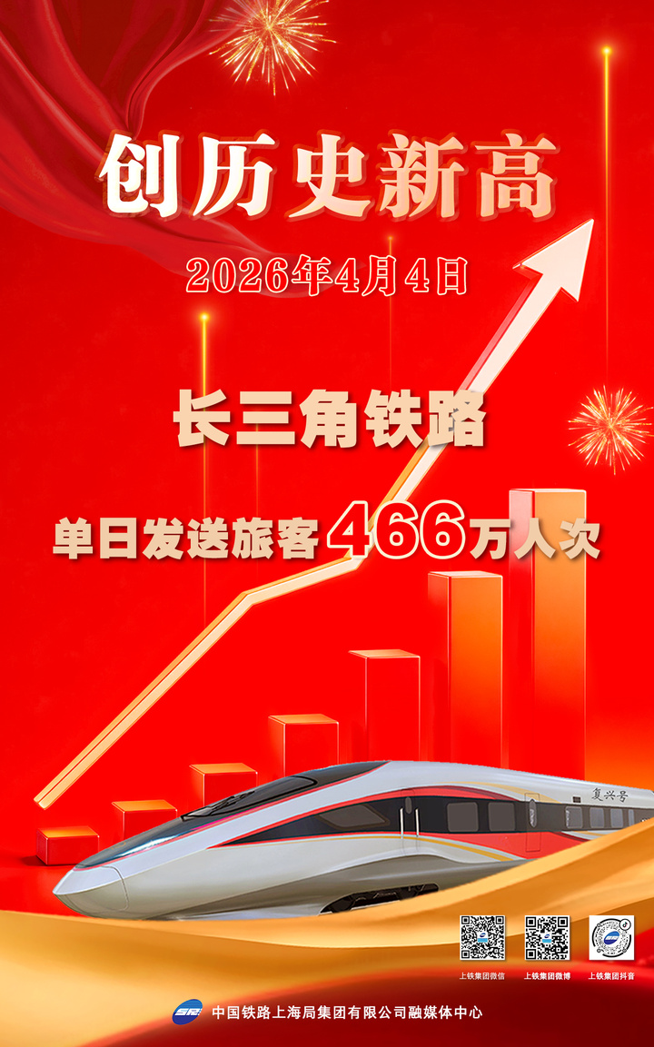4月4日,新华日报·交汇点记者从中国铁路上海局集团有限公司(以下简称“上铁集团”)获悉,长三角铁路当日发送旅客466万人次,超过2025年5月1日单日发送旅客426.8万人次的最高纪录,创单日客发量历史新高。