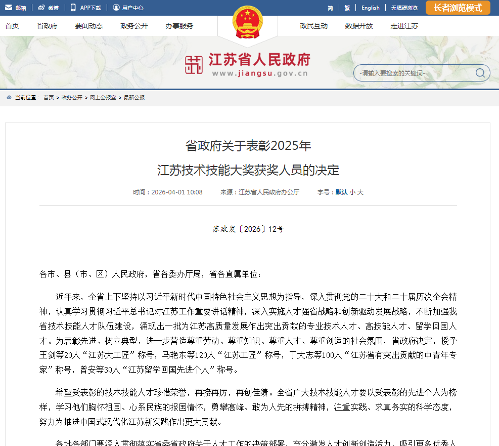 近年来,全省上下坚持以习近平新时代中国特色社会主义思想为指导,深入贯彻党的二十大和二十届历次全会精神,认真学习贯彻习近平总书记对江苏工作重要讲话精神,深入实施人才强省战略和创新驱动发展战略,不断加强我省技术技能人才队伍建设,涌现出一批为江苏高质量发展作出突出贡献的专业技术人才、高技能人才、留学回国人才。为表彰先进、树立典型,进一步营造尊重劳动、尊重知识、尊重人才、尊重创造的社会氛围,省政府决定,授予王剑等20人“江苏大工匠”称号,马艳东等120人“江苏工匠”称号,丁大志等100人“江苏省有突出贡献的中青年专家”称号,曾安等30人“江苏留学回国先进个人”称号。