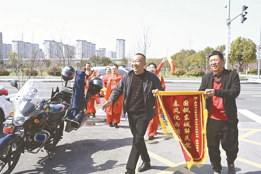 3月29日,盐城市公安局亭湖分局东城派出所门前来了一支腰鼓队,杨先生用敲锣打鼓的“仪式感”感谢民警帮助调解二手车交易矛盾;