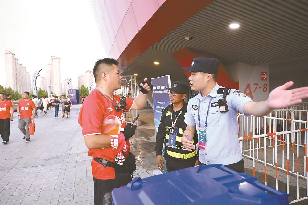 “请出示您的证件”“充电宝容量符合标准可以带进”……8月30日18时,盐城奥体中心安检口迎来观众入场高峰。