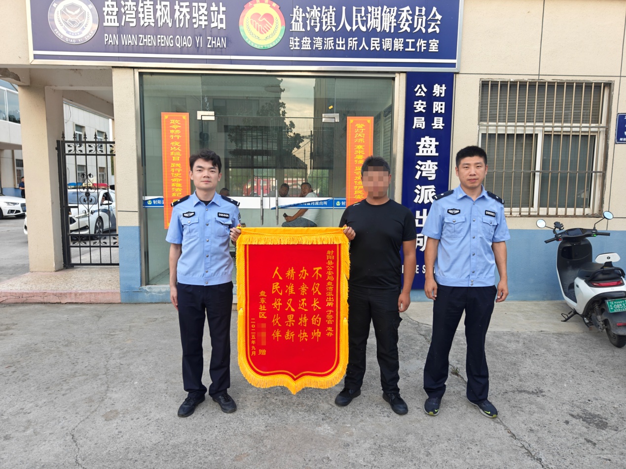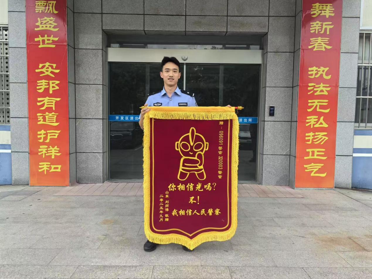 9月15日下午,盘湾派出所收到辖区居民刘某送来的一面书有“不仅长的帅办案还特快精准又果断人民好伙伴”的锦旗,感谢民警快速反应、雷霆出击、快速抓捕,及时为群众追赃挽损。