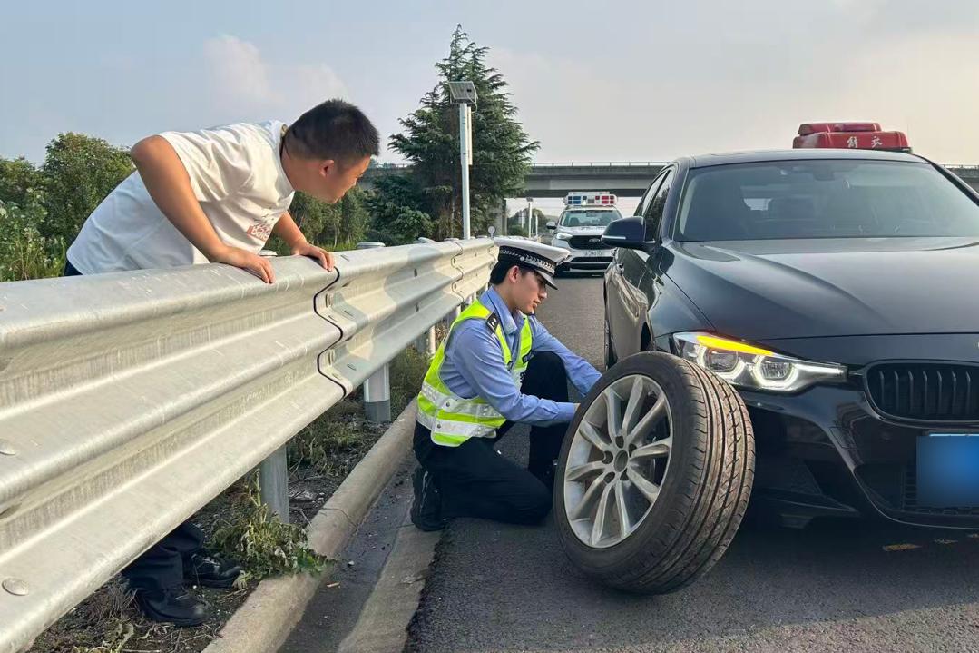 10月6日中午,盐城市公安局交管支队高速一大队民警杨航在高速上巡逻时发现一位司机对爆胎车辆手足无措,立即与同事上前摆放警示标志、引导车辆、利落地帮司机换好车胎;
