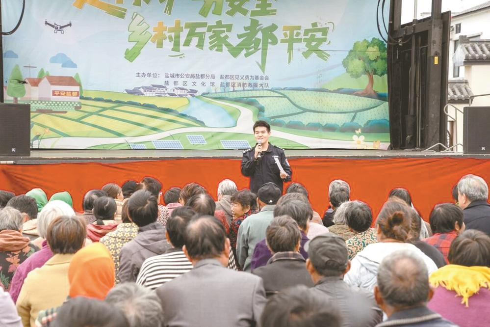 文艺表演环节更是精彩纷呈,润民心且寓教于乐。盐都公安和盐都消防文艺小分队踩着欢快的节拍登场,瞬间点燃了全场的热情,现场欢呼声此起彼伏。开场的打鼓说唱节奏明快、气势十足,鼓点一响便将现场氛围推向高潮。随后的反诈宣讲以“剧情讲述+干货解析”的形式呈现,反诈民警用亲身的办案经历讲述反诈案例,不说教、不空讲,每一句话都实实在在地落到了实处,让台下的村民们直呼“长见识”。旋律悠扬的萨克斯演奏让大家放松身心,也寓意着安全宣传如这音乐般温柔细致、润物无声。