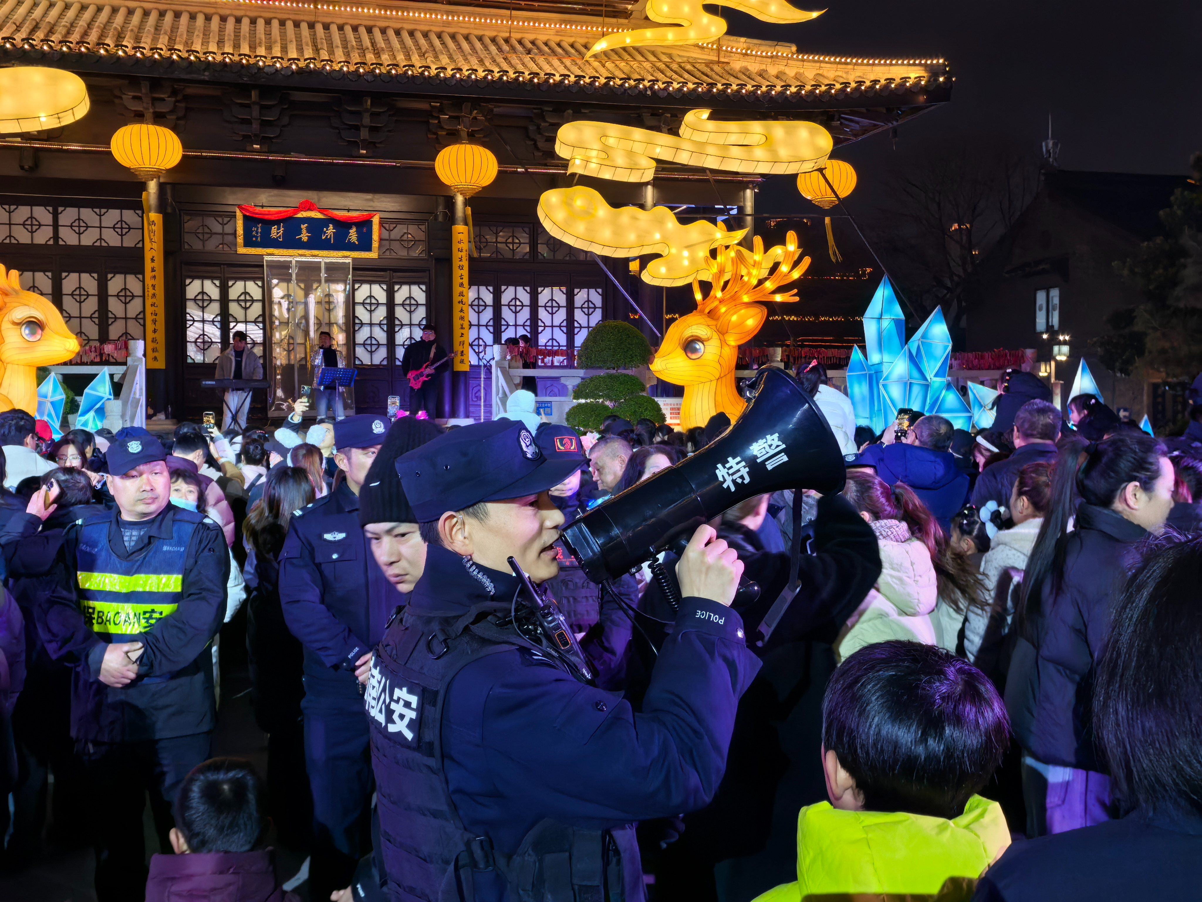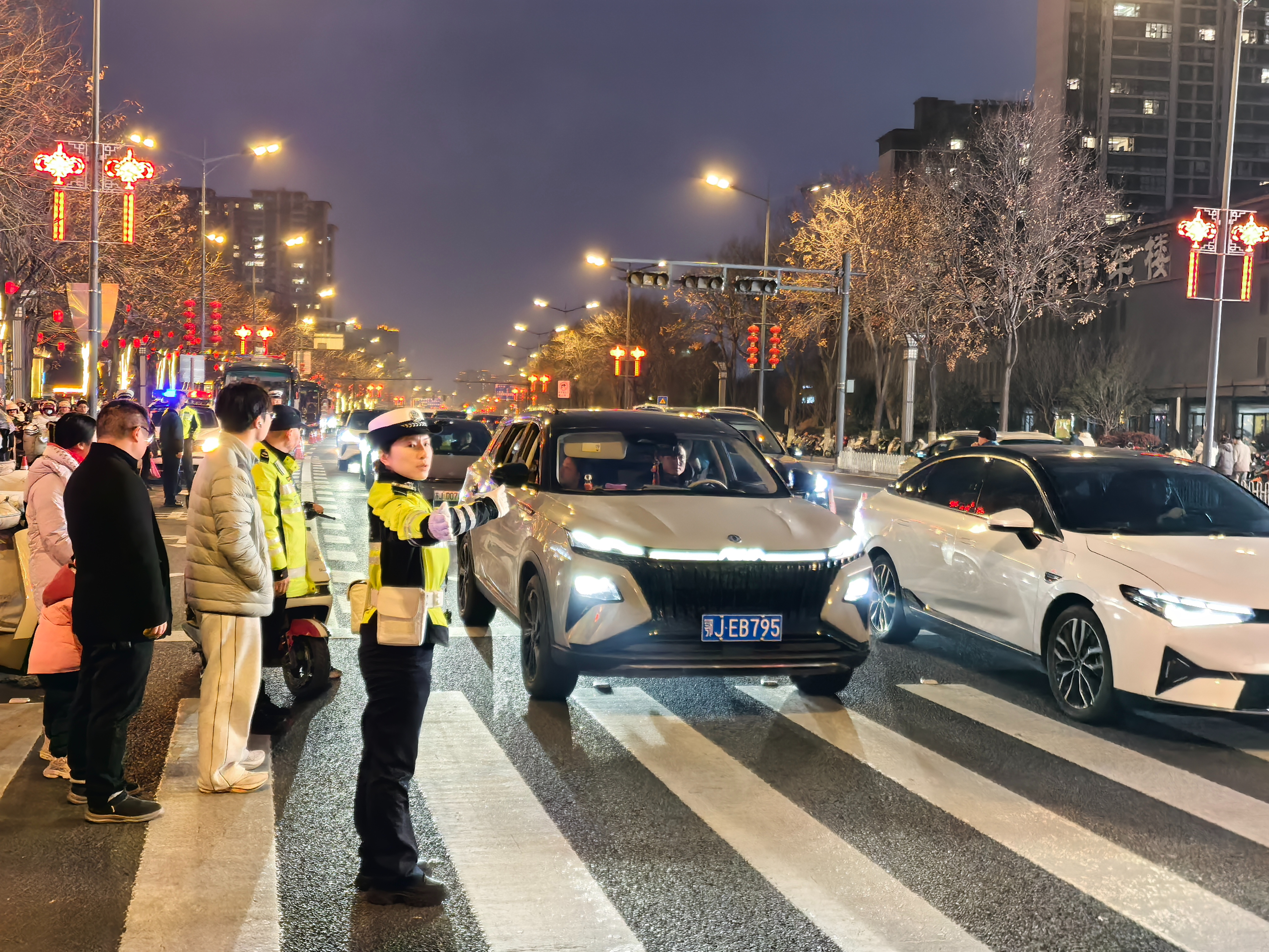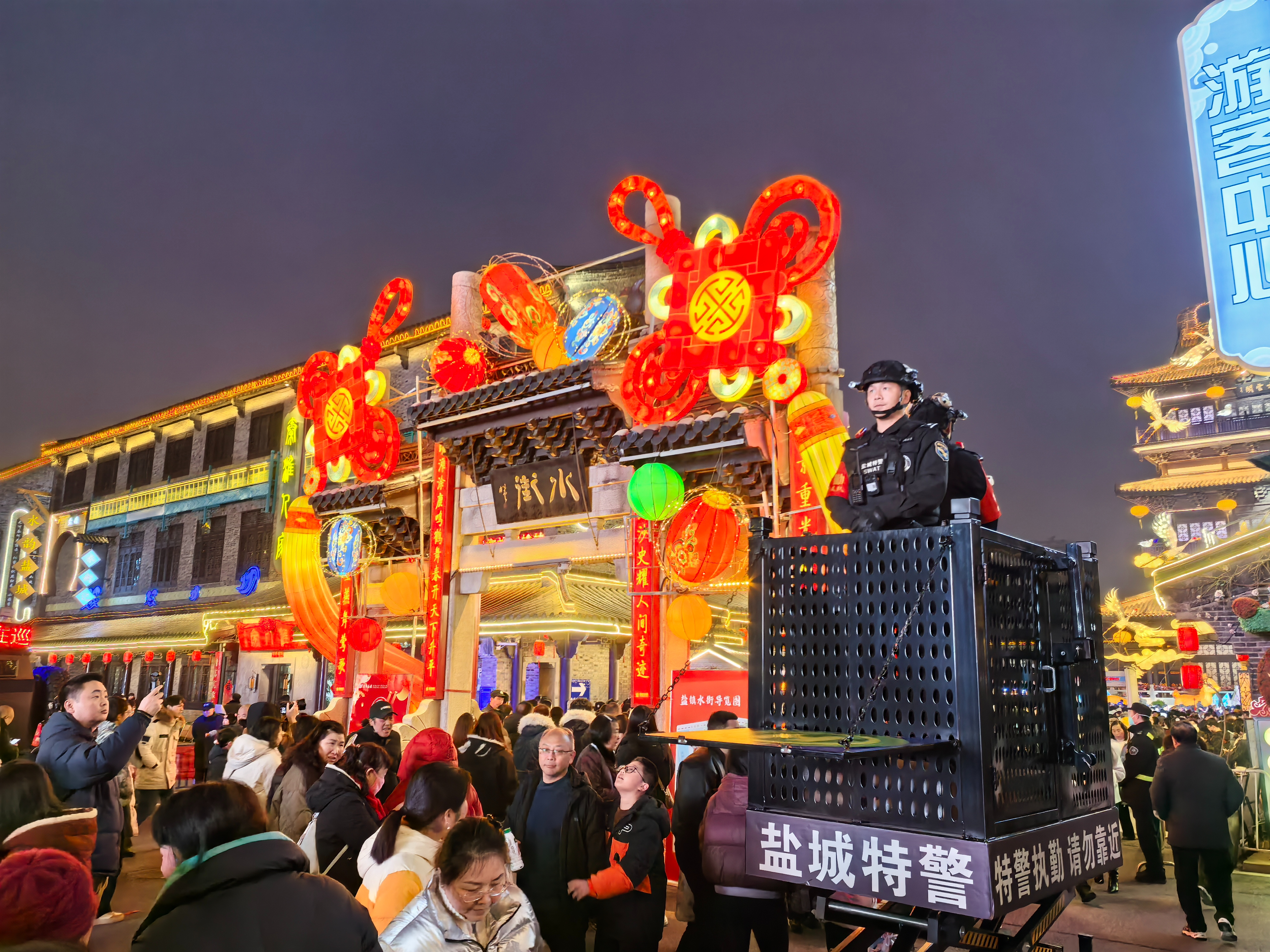 晚上8点,人流、车流达到峰值,执勤民辅警快速响应、高效疏导,全力保障道路畅通。“今年峰值人流量约2万人,我们重点针对景区出入口、周边路口等关键节点增派警力,实时监测车流、人流变化,优化路口信号灯配时,及时疏导拥堵路段,全力保障群众出行安全顺畅。”盐城市公安局交管支队相关负责人介绍。