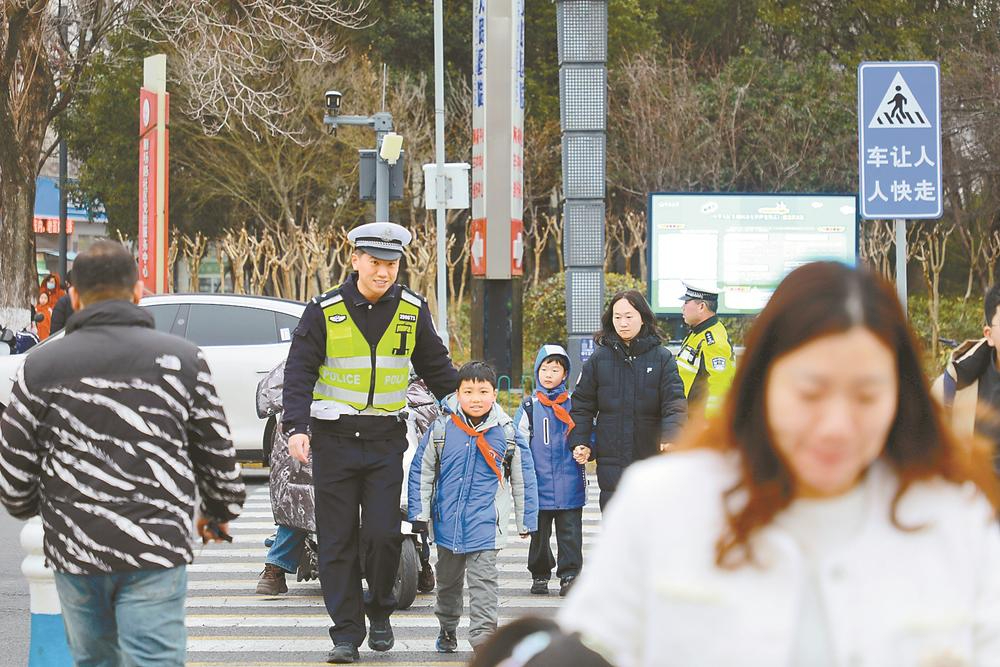 开学第一天,校园门口熟悉的身影就像“老朋友”一般准时出现,久别重逢的笑脸、从未改变的藏蓝与荧光绿,成为开学季最融洽的搭配。大手牵小手,平安过马路。民辅警提前到岗到位,在路口、校园周边疏导交通,保障师生平安通行。