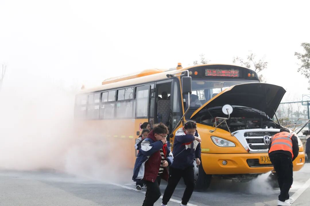 “着火了!大家不要慌”“捂住口鼻,跟我下车!”随着一阵浓烟从校车尾部冒起,一场紧张有序的应急疏散在射阳县海都实验小学的操场上演。