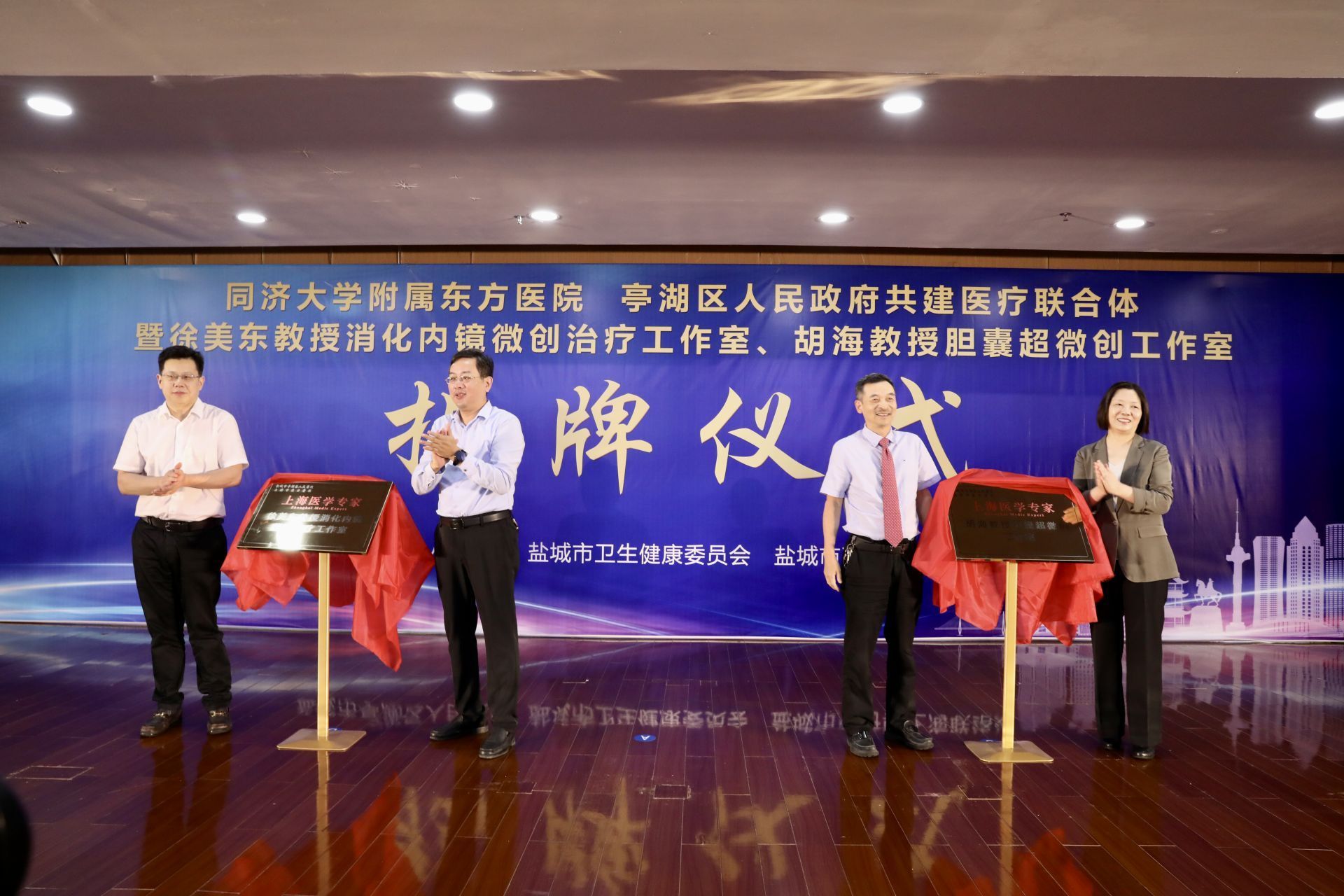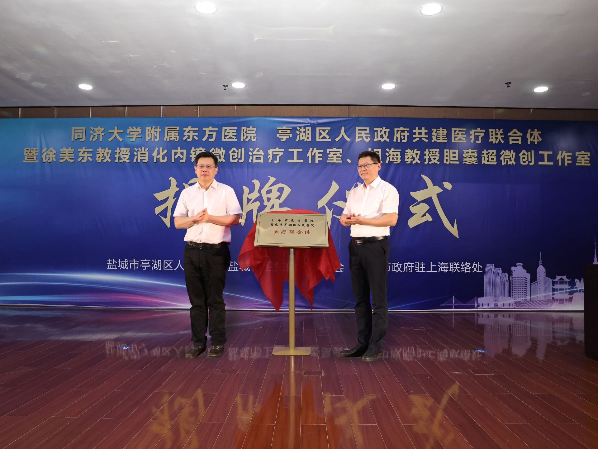 活动中,双方为“盐城市亭湖区人民医院同济大学附属东方医院医疗联合体成员单位”“上海医学专家徐美东教授消化内镜微创治疗工作室”和“上海医学专家胡海教授胆囊超微创工作室”揭牌。开幕式由亭湖区副区长丁长海主持。市、区相关部门负责同志及同济大学附属东方医院部分专家代表参加。此次活动由亭湖区人民政府、市卫生健康委员会、市政府驻上海联络处主办,亭湖区卫生健康委员会、市亭湖区人民医院承办。