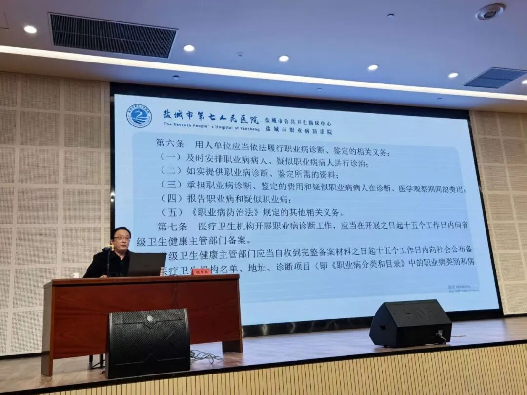 盐城市第七人民医院(盐城市职业病防治院)是经市委、市政府批准唯一承担全市职业病诊断治疗、职业健康体检的公立医疗机构,为履行公共卫生职责,落实市卫健委关于加强职业病健康知识培训的工作要求,市七院(盐城市职业病防治院)秉持服务社会的公益初心,针对当前部分企业职业健康管理知识匮乏、健康防护措施落实不到位、主体责任履行不全面等现状,报经市卫健委同意,于11月29日联合市疾病预防控制中心,面向全市企业组织举办了第一期职业病管理知识培训班。