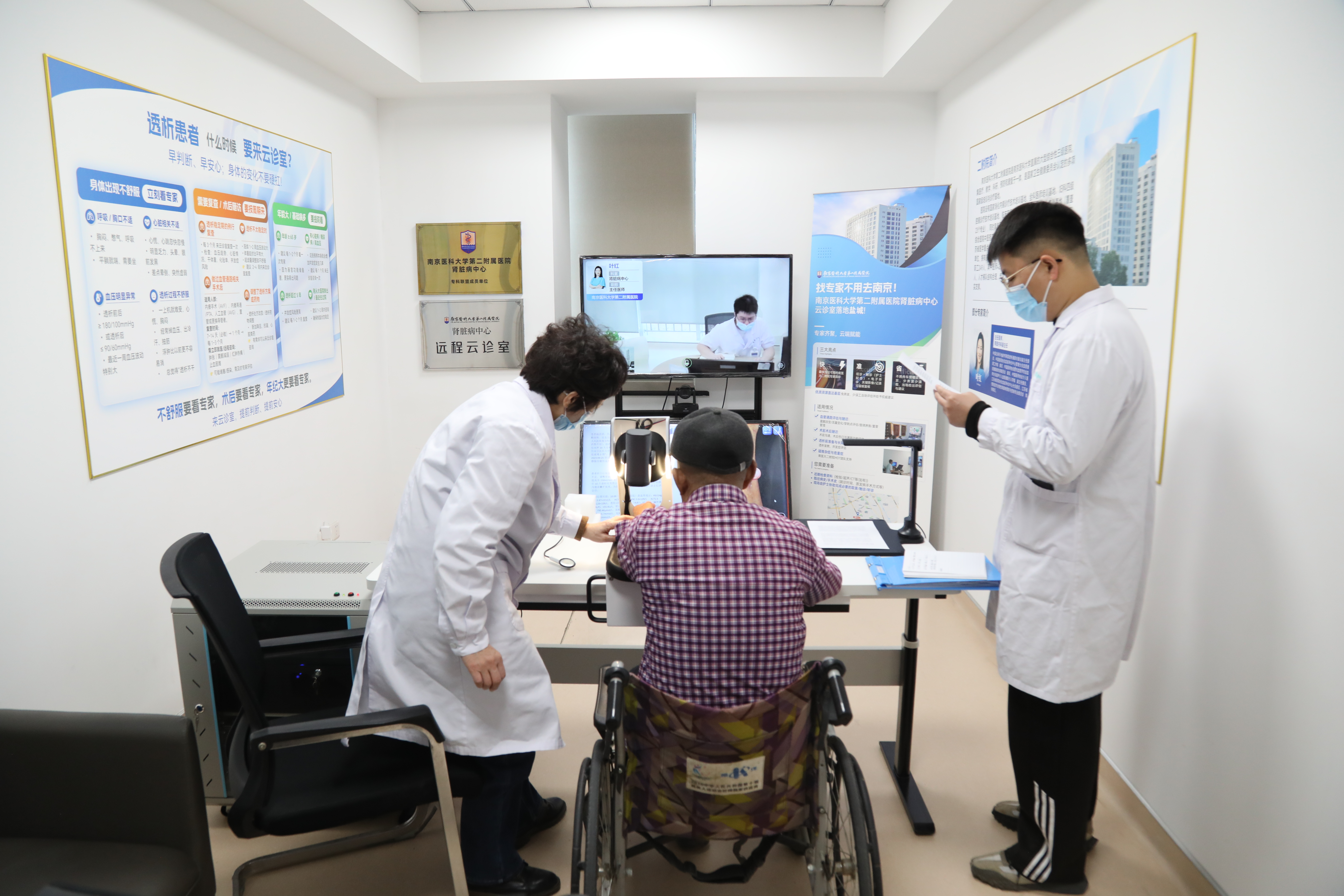高拍仪下,患者的病情描述一目了然,大屏幕上,南京医科大学第二附属医院肾内科叶红主任仔细查看病人的血钾指标、血管超声等。“作为国内肾内科领域的顶级专家,叶教授的号即便在网上预约,都要提前至少一周左右,如今我们在燕舞血液透析中心,只要进入这个云诊室,就能听到叶教授对我的诊断建议,我还能提出我的疑问,她都耐心一一解答。不用奔波,不用预约挂号,就能与省城大专家面对面,放在以前,想都不敢想。”盐都患者张先生提起这次“云诊疗”,感激之情溢于言表。