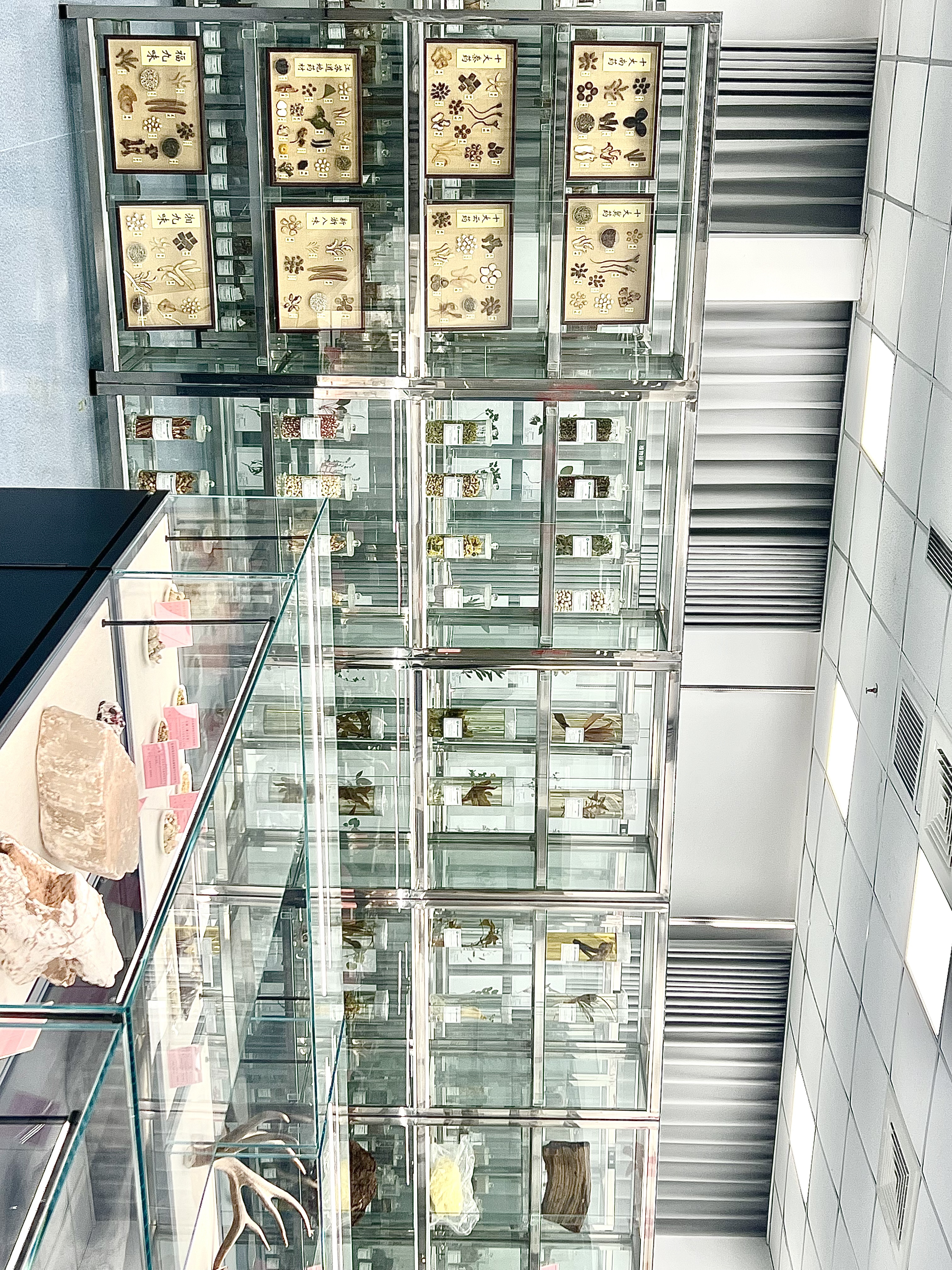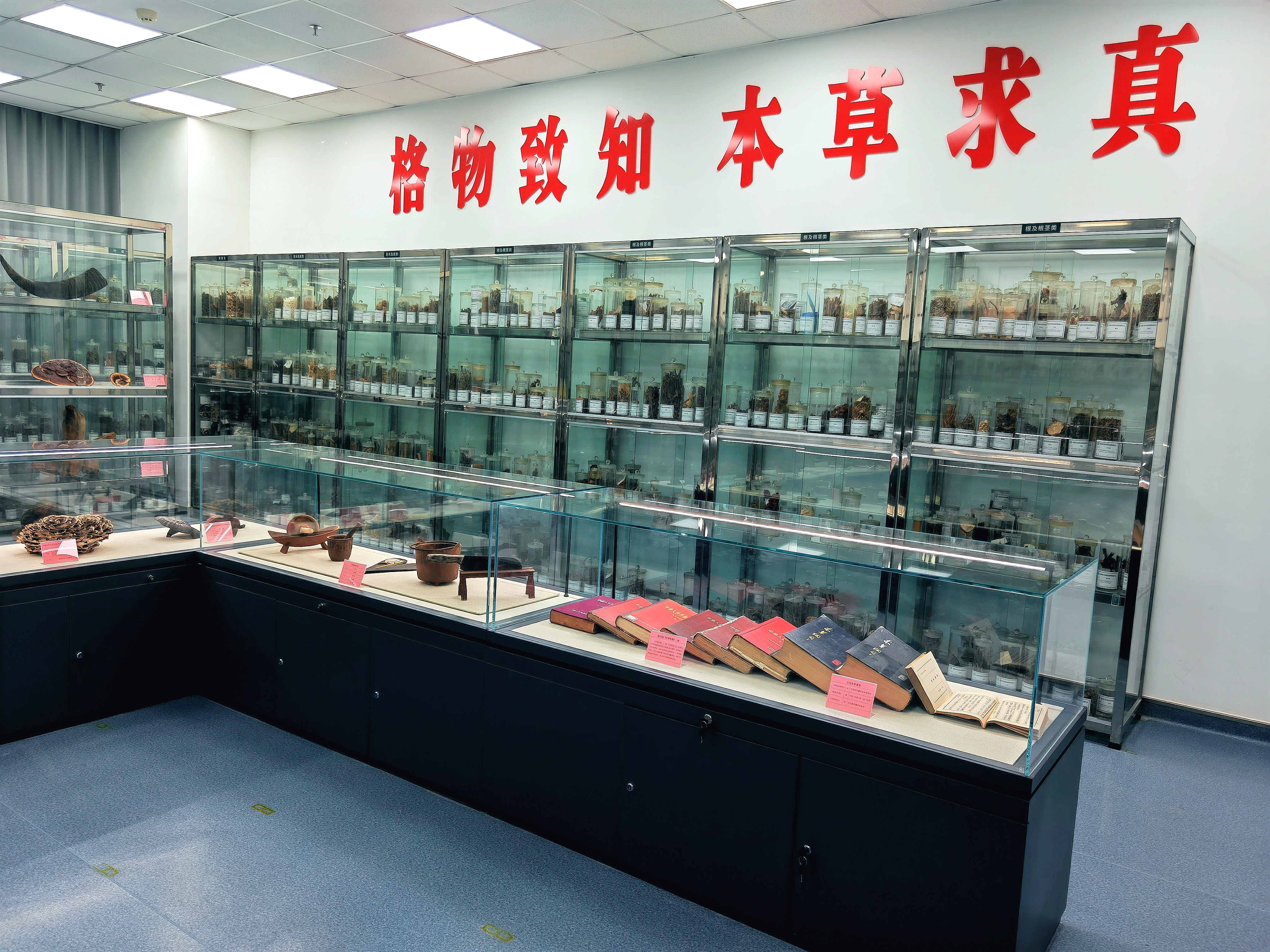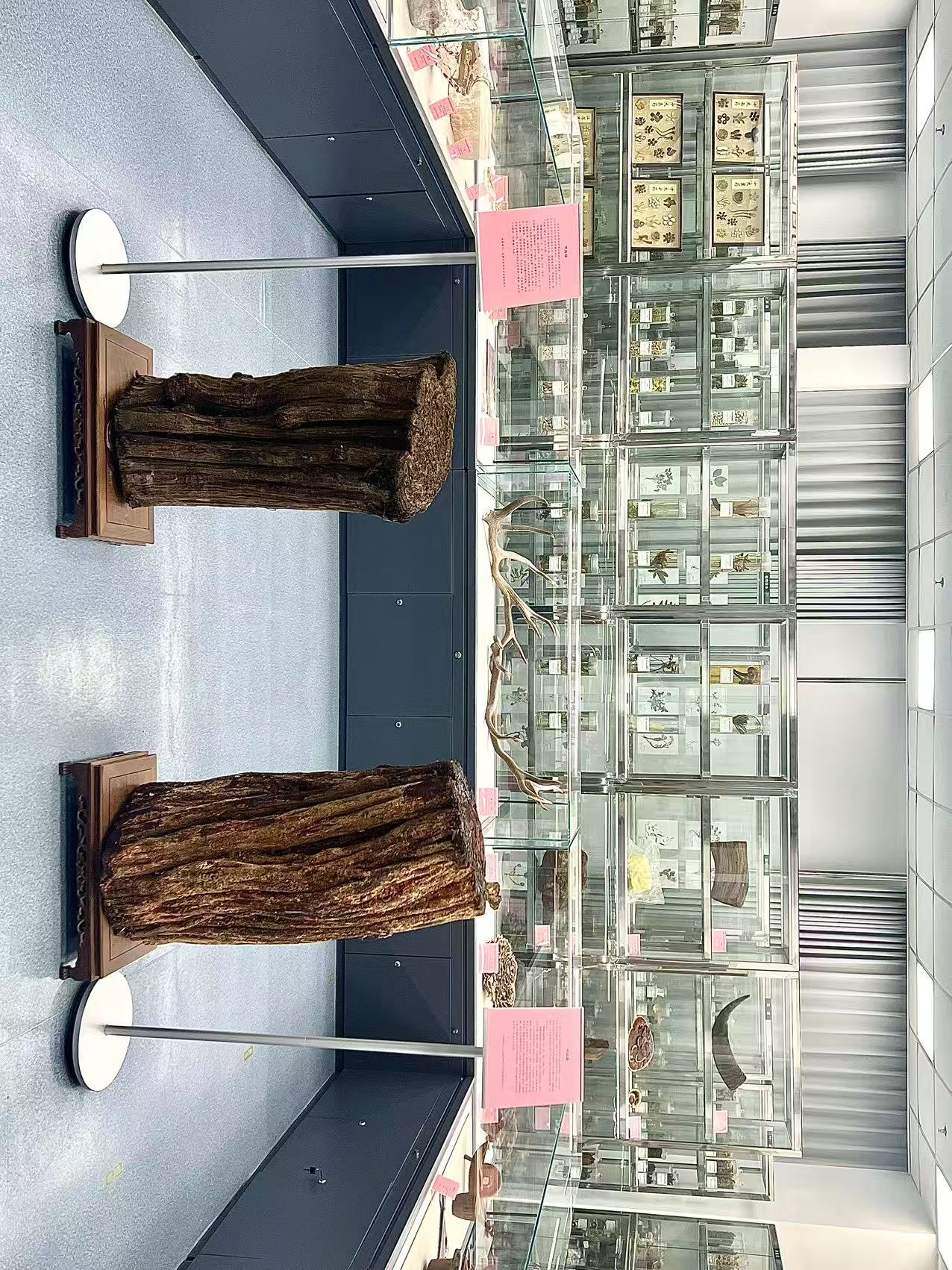 该标本馆位于市食品药品监督检验中心四楼,展陈面积约180平方米。步入馆内,两株藤龄逾百年的鸡血藤和黑血藤苍劲古朴,引人注目。它们分别采自云南和广西,是标本馆建立过程中从道地产区采集的珍稀品种。馆内标本按根茎类、茎木皮类、叶花全草类、果实种子类、动物矿物类等门类系统陈列,涵盖灵芝、人参、鹿角等名贵中药材,既有浸制液保留鲜活形态的标本,也有干制并标注详细信息的腊叶标本,形成了一部立体可查的中药资源图谱。