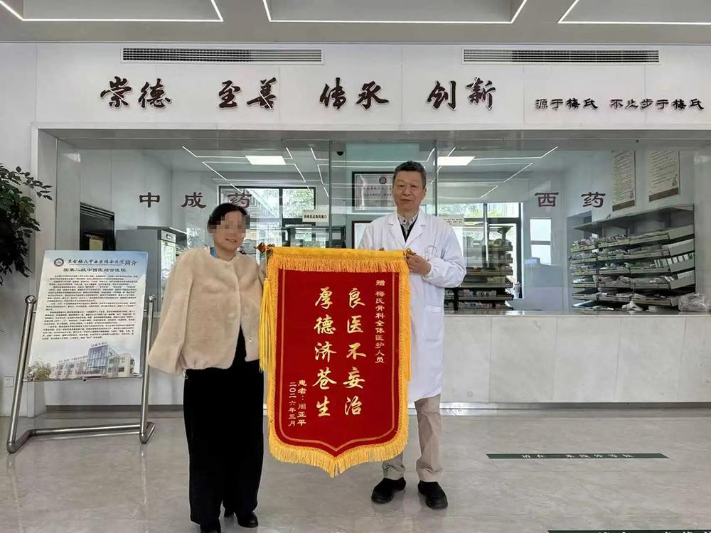 “良医不妄治,厚德济苍生”——这面由盐城市大丰区周女士精心定制的锦旗,字字饱含真情,既是对梅氏中西医结合医院全体医护人员仁心仁术的由衷赞誉,也是对医院温馨细致服务的真切肯定。