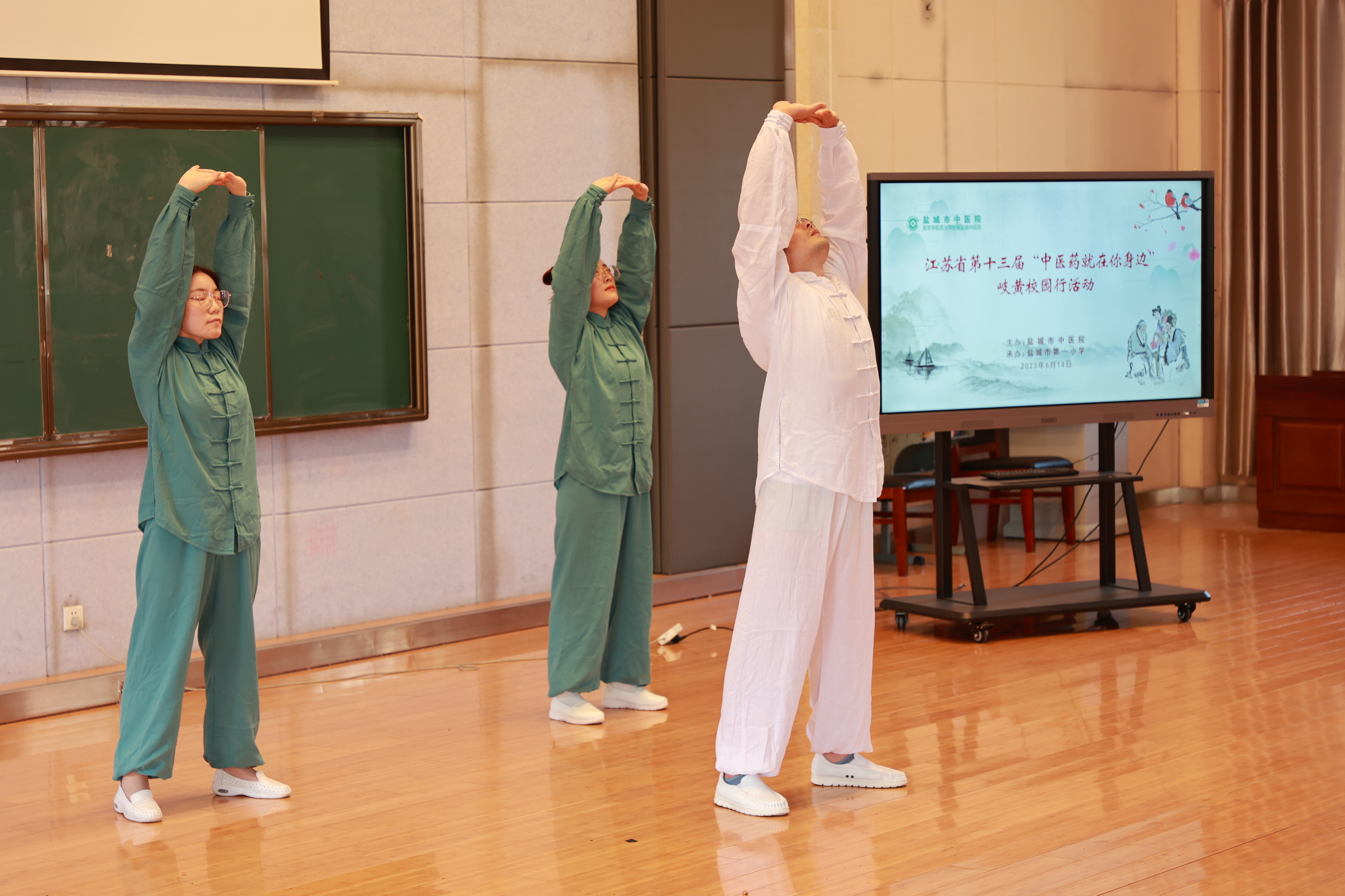 中医院医师们给孩子们表演了“八段锦”,瞧,孩子们看得多入神, “双手托天理三焦,左右开弓似射雕......” 都忍不住跟着功法口诀一招一式练了起来,精气神十足!活动最后,盐城市中医院给孩子们赠送了中医药文化故事书,希望孩子们从小信中医、爱中医、用中医。
