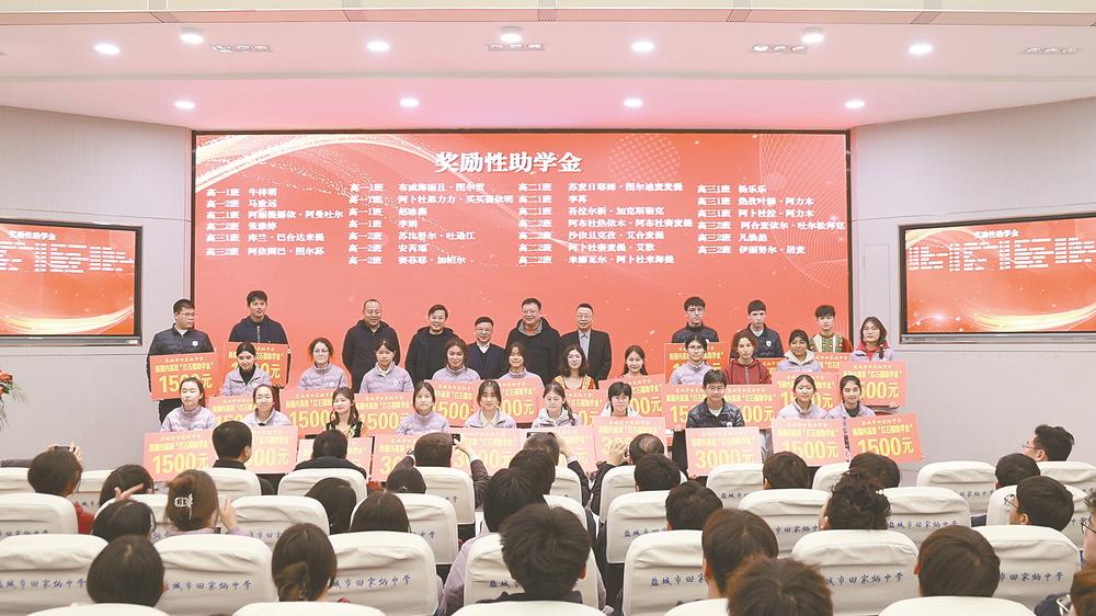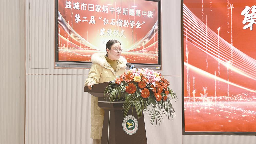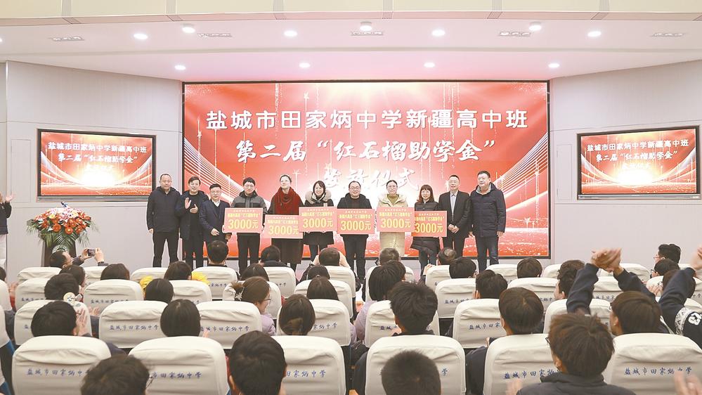 2023年底,盐城市田家炳中学新疆内高班“红石榴助学金”项目正式启动。2024年1月15日,在第一届“红石榴助学金”发放仪式上,13家爱心助学企业共计向58名学生、6名教师发放15.8万元助学金。“这份沉甸甸的爱,带给我们的不仅是生活无虞的温暖,更是奋力拼搏的动能。”盐城市田家炳中学党委书记、校长刘晶在发放仪式上说,“我们深知,‘红石榴助学金’的设立,是党和政府对民族教育事业的重视和关心,是爱心企业家们对天山学子的关爱和奉献,是大家对新疆内高班师生的托付和厚望。在今后的工作中,我们必将以勇于担当的精神,砥砺深耕的底色,书写让人民满意的答卷!”