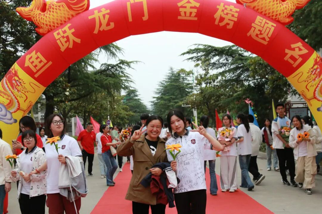 典礼尾声迎来动人一幕:教师与家长代表手持金葵,列队于青春剧场东门至“龙门”两侧。老师们擂响战鼓,学子们踏着祝福红毯,一支支象征“一举夺魁”的向日葵被送入手中,同学们昂首阔步,鱼跃龙门!