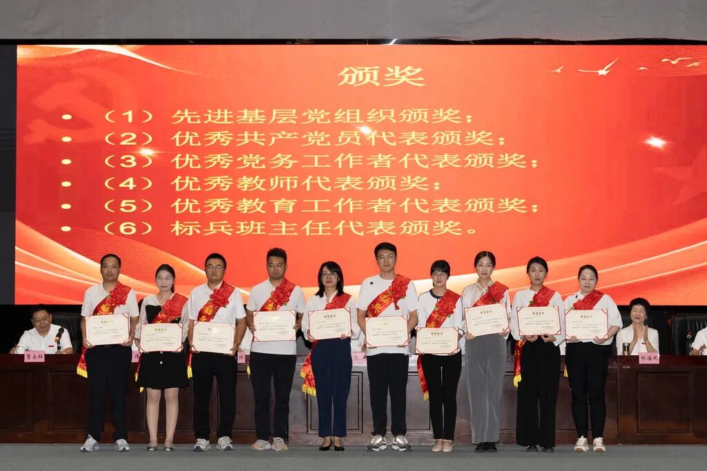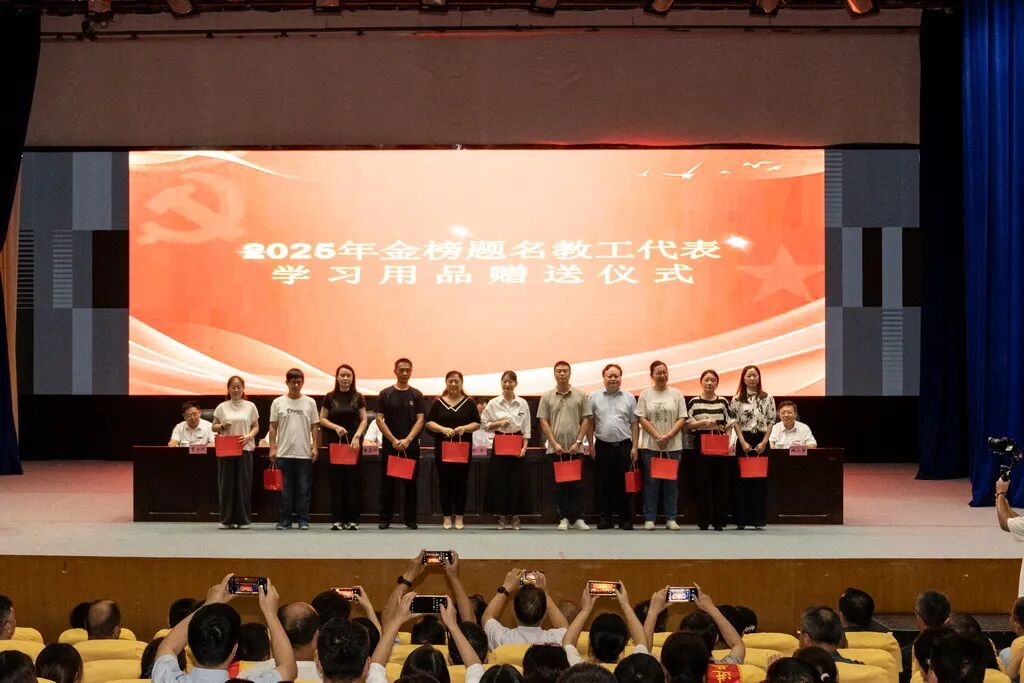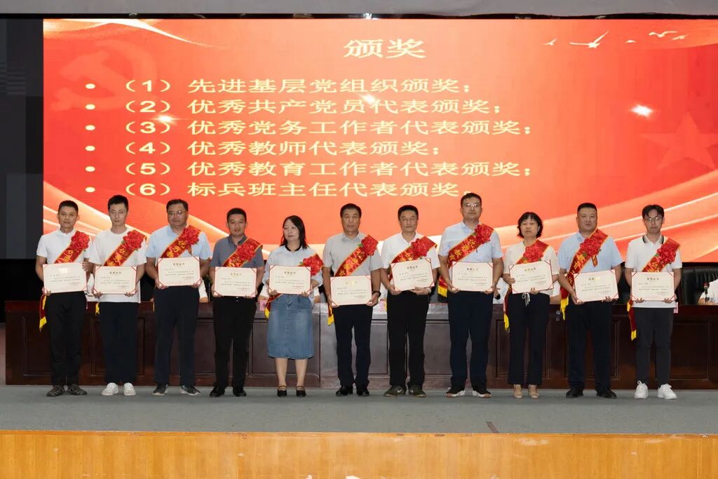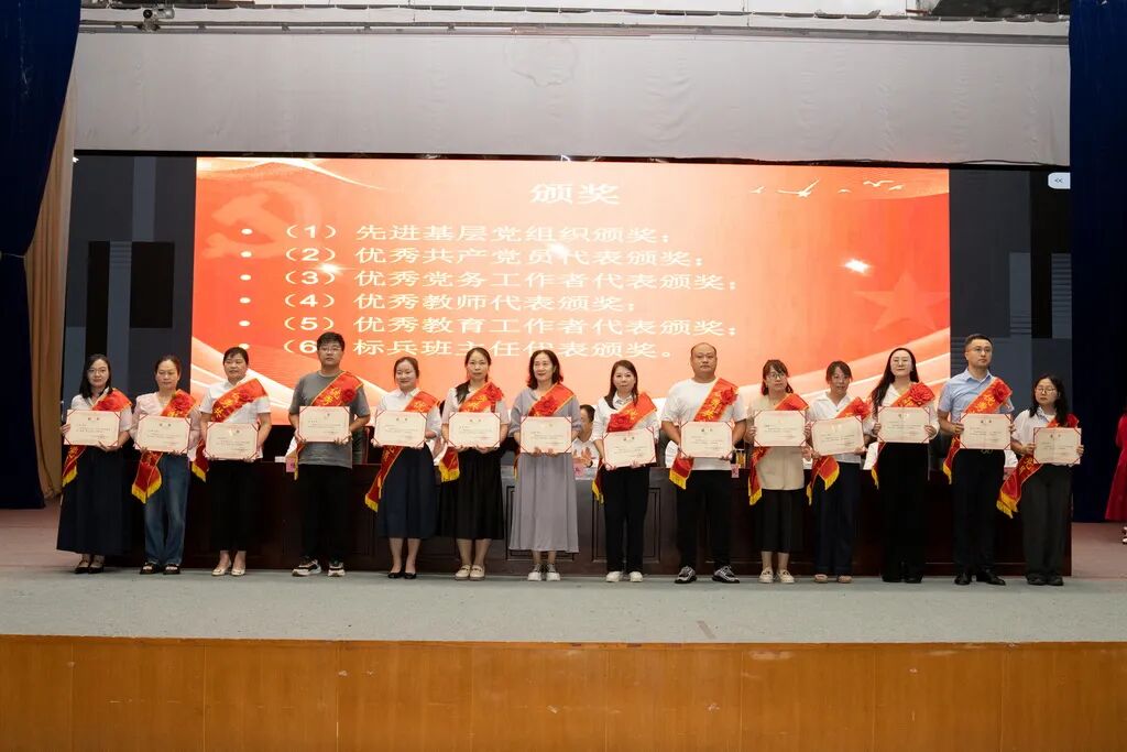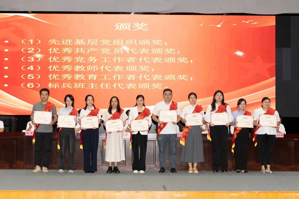 会上表扬了2024-2025学年度先进基层党组织、优秀共产党员、优秀党务工作者、优秀教师、优秀教育工作者、标兵班主任,新入职的教师进行了集体宣誓,现场举行了青蓝结对仪式,向2025年金榜题名教工代表赠送学习用品。