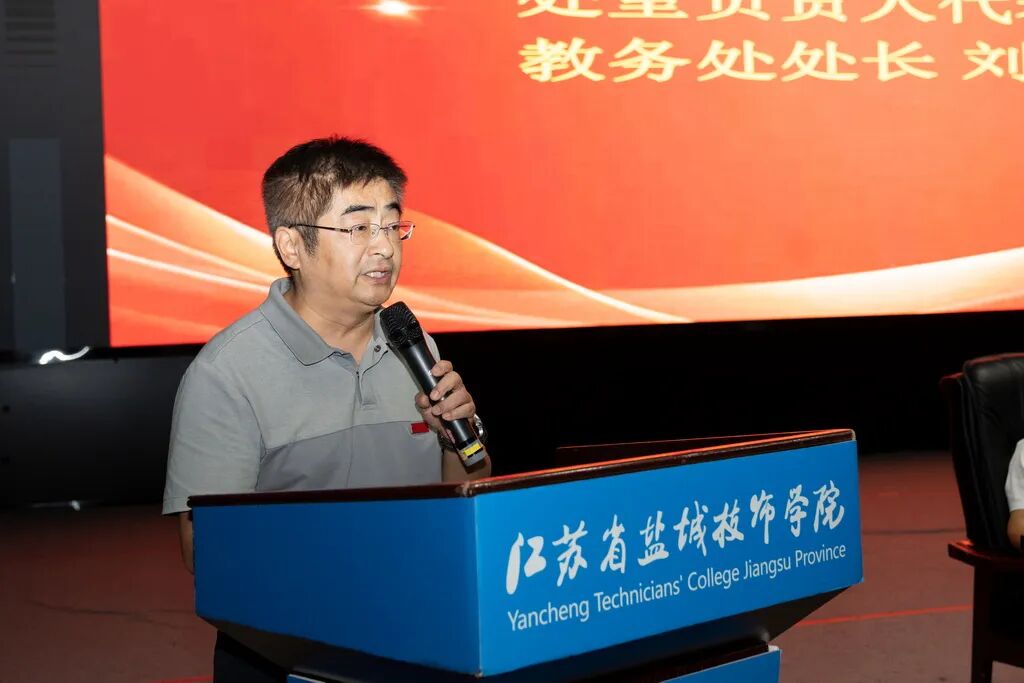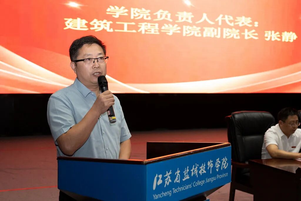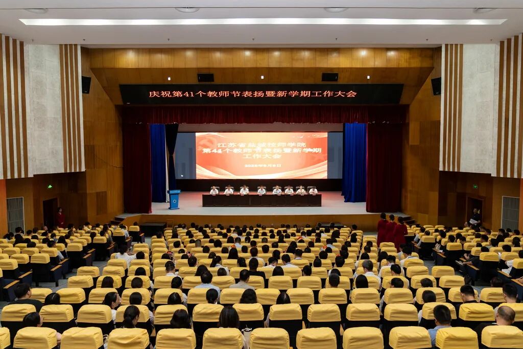 9月9日下午,江苏省盐城技师学院庆祝第41个教师节表扬暨新学期工作大会在文港路校区学术报告厅举行,校长张兵以《勇担新使命奋进新征程奋力谱写学校高质量特色发展新篇章》为题作工作报告,并给新入职教师授发校徽。党委副书记、副校长夏建友主持会议。