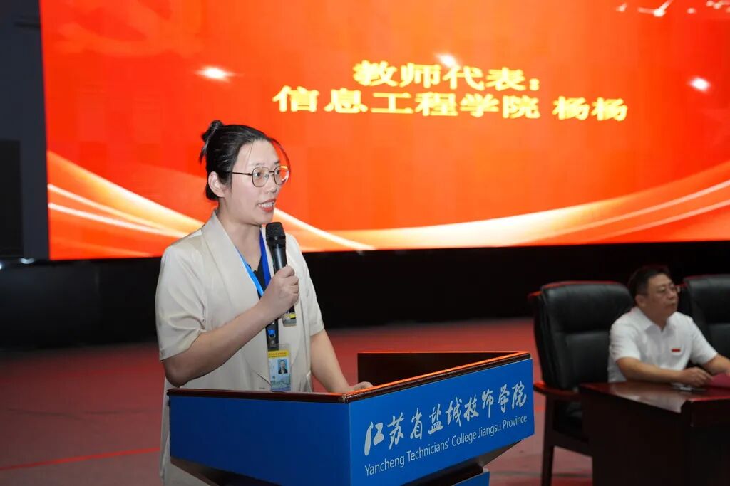 信息工程学院教师杨杨、建筑工程学院副院长张静、教务处处长刘锋分别发言,校党委班子成员,全体教职工出席。