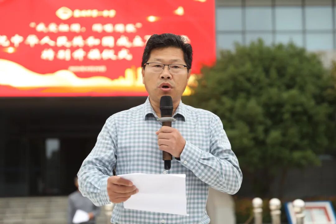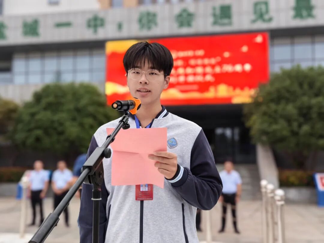高三(5)班陆思帅同学作为学生代表发言。他回顾祖国七十余载辉煌历程,呼吁同学们“将个人的理想融入时代的洪流”,并郑重表示:“祖国的强盛,离不开一代又一代人的接续奋斗;民族的未来,正呼唤着我们青年一代的担当。”