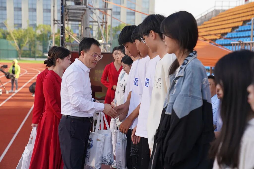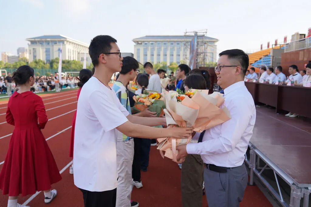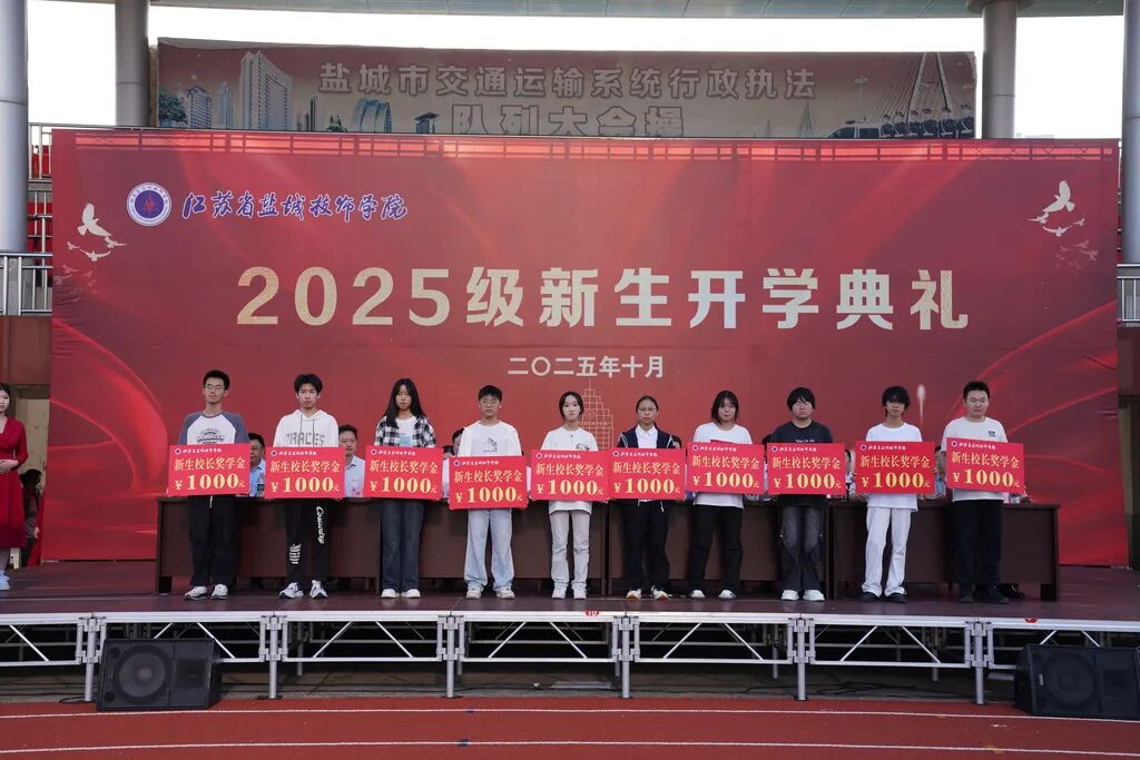 典礼上颁发了新生校长奖学金,为2025级新生中的11对双胞胎赠送了学习用品,进行了“盐小匠”健身操展示。新生代表向到场的父母献上鲜花。新生及家长代表、老生代表第三届全国技能大赛金牌选手、优秀校友代表、教师代表先后发言。典礼在全场师生《歌唱祖国》嘹亮的歌声、激昂的旋律中圆满落幕。
