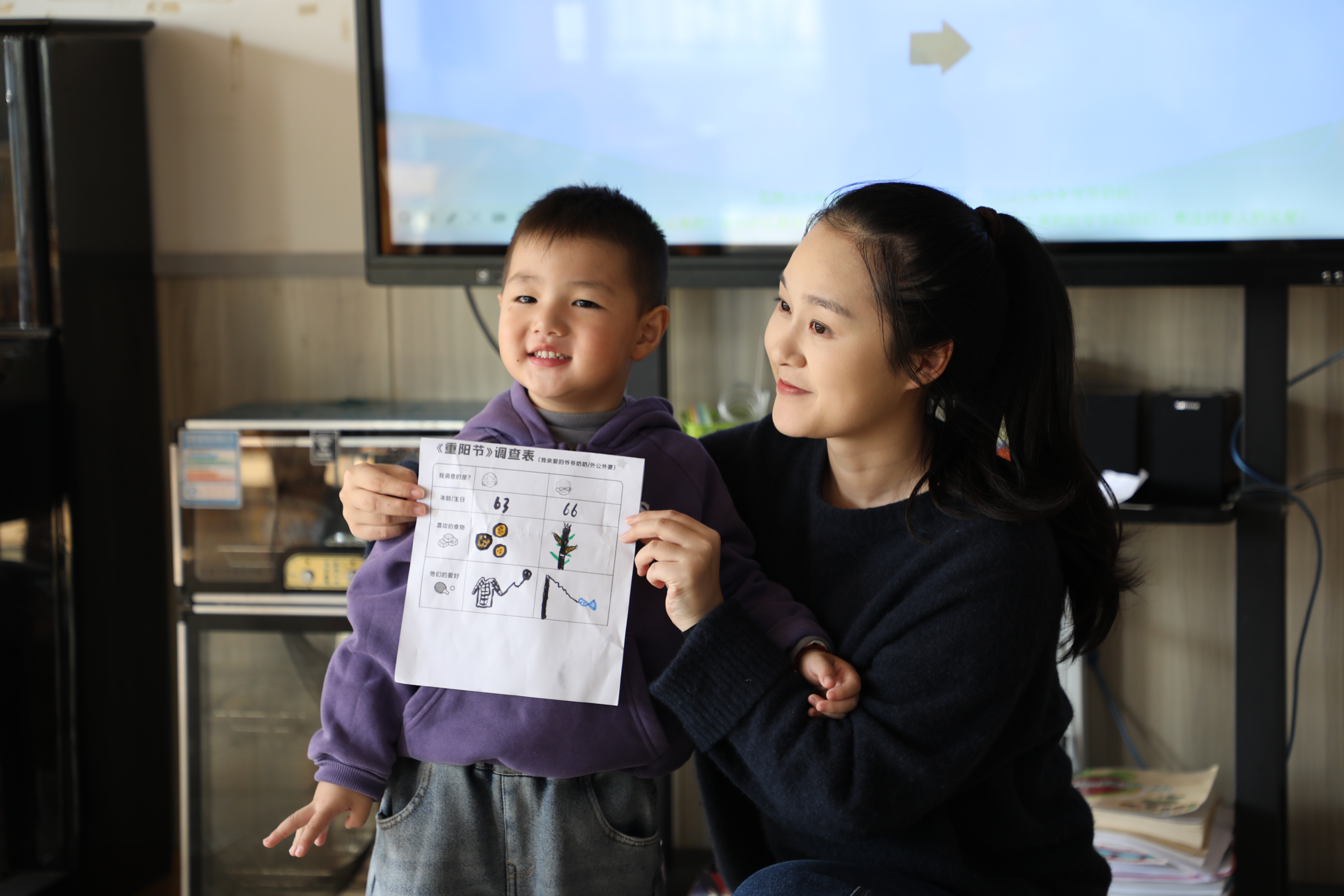 在小班教室,老师正通过《爷爷一定有办法》等绘本,引导孩子们回忆祖辈陪伴的温暖瞬间,再用“重阳知多少”问答游戏,将登高、赏菊等习俗融入趣味互动,孩子们举着小手踊跃抢答,眼神里满是好奇。“老师说,重阳节是爷爷奶奶的节日。我知道要陪奶奶去公园散步,就像奶奶平时陪我一样。”射阳县黄沙港镇实验幼儿园幼儿唐槿龄稚声稚气地说。