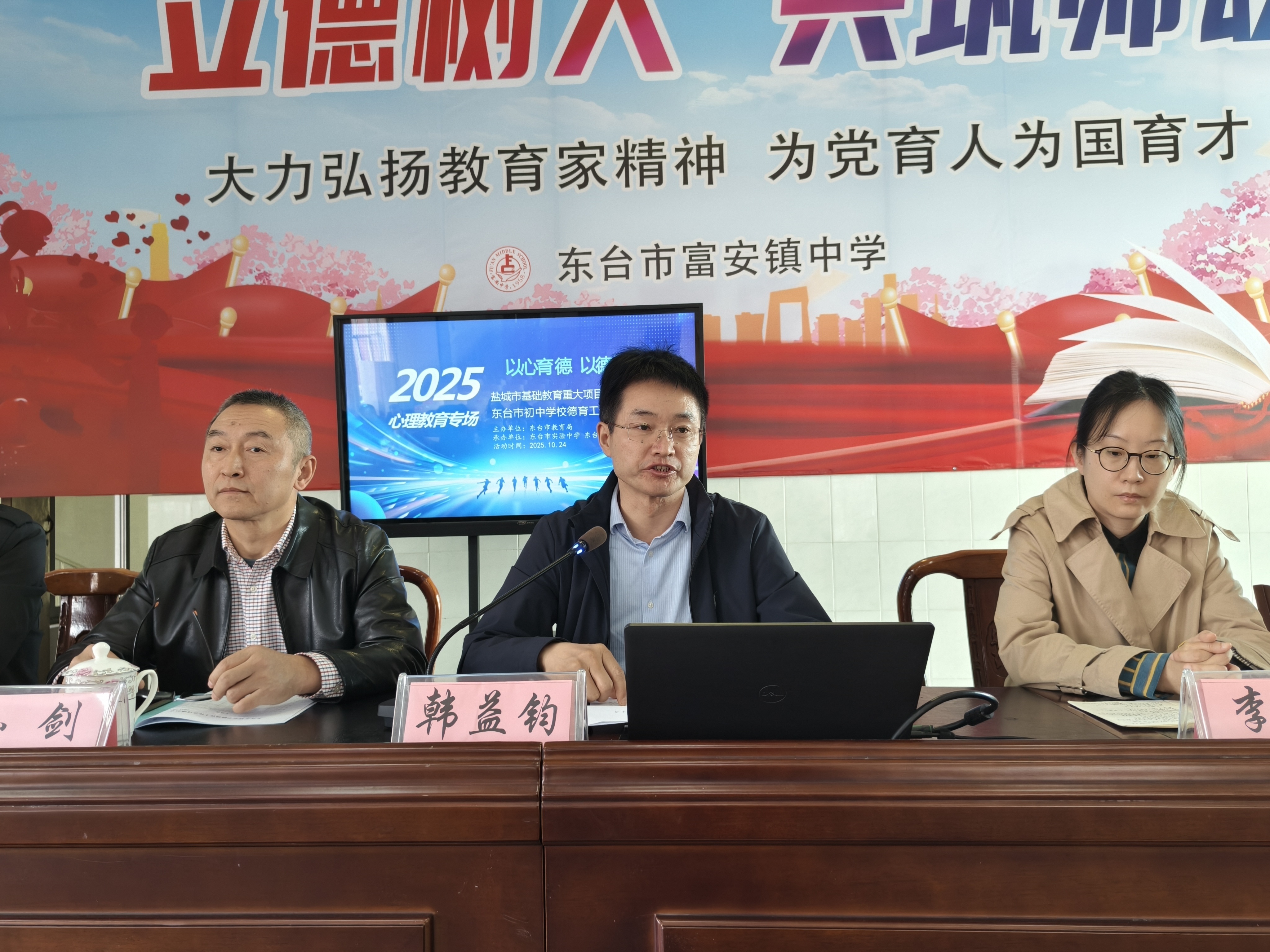 十月风清,心育同行。10月24日下午,盐城市基础教育重大项目暨东台市初中学校德育工作专题会议“心理健康教育专场”在东台市富安中学隆重举行。作为东台市初中校德育共同体建设的关键推进载体,本次会议以“以心育德,以德润心”为主题,汇聚市教育局领导、省内心理健康教育专家及全市各初中德育分管领导、专职心理教师,聚焦初中心理教育痛点难点,交流实践经验,共绘县域初中德育协同育人新蓝图。此次会议的召开,既是对盐城市基础教育重大项目建设成果的阶段性检验,更是东台市深化初中德育共同体建设、打造县域德育新矩阵的重要举措。