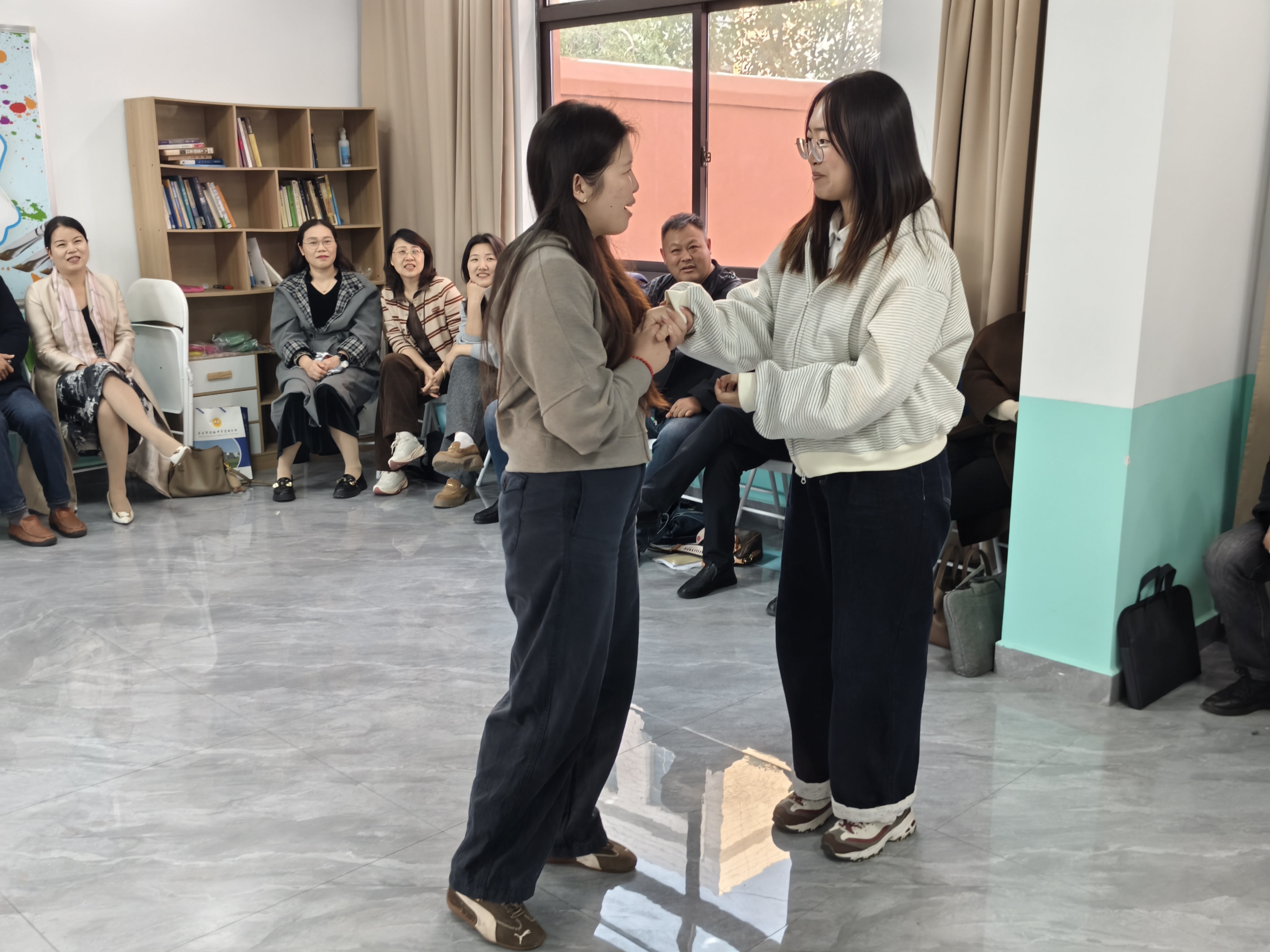 南京市外国语学校教师、南京市心理学科带头人吴蓉老师则聚焦心理教师专业能力提升,开展了团体辅导实操培训。她以“大风吹”“梅花几朵开”等游戏,迅速活跃现场气氛。随后,将全体参会人员按生日分为4个小组,开展实操演练。各小组通过即兴表演、头脑风暴、合作设计、团体展示等环节,掌握团体辅导的设计技巧。“好久没有这样开心过了!这种理论与实操兼具的培训,易学易操作,很实用。”活动后,一位乡村初中心理教师说。