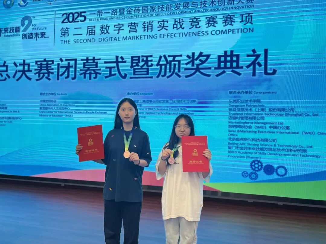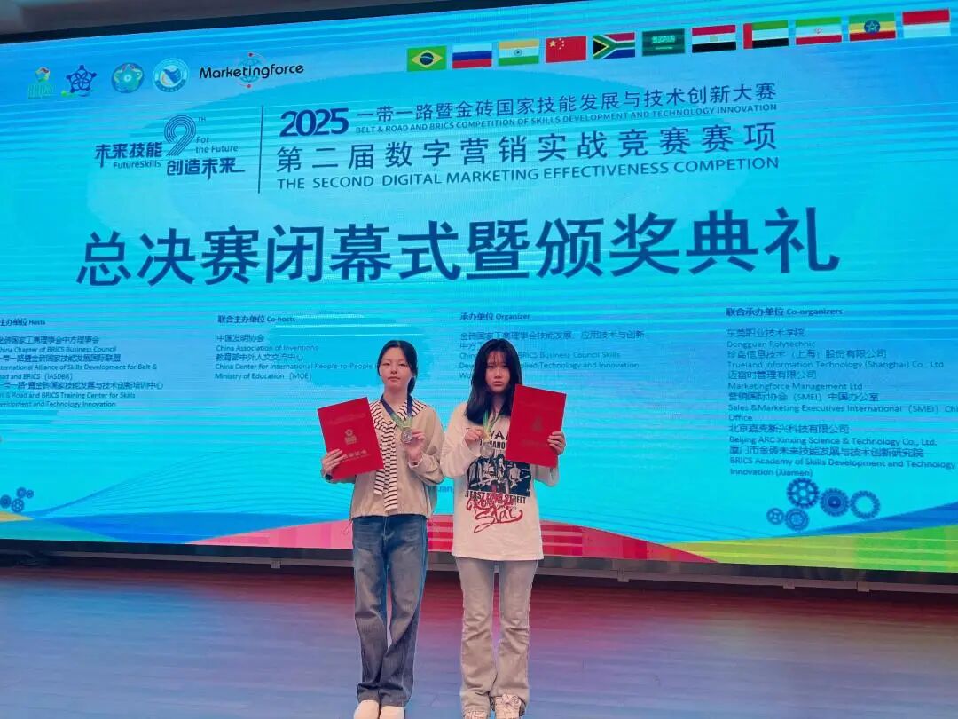 在全国总决赛中,面对来自全国各地的强劲对手,2组选手沉着应战、默契配合,在数字营销实战环节中展现出过硬的专业技能和创新思维。最终,凭借扎实的专业功底和出色的实战能力,刘婷玉、孙圩蕾团队荣获二等奖,张鑫钥、贾欣缘团队荣获三等奖。