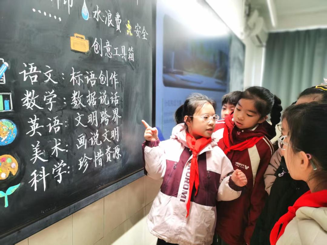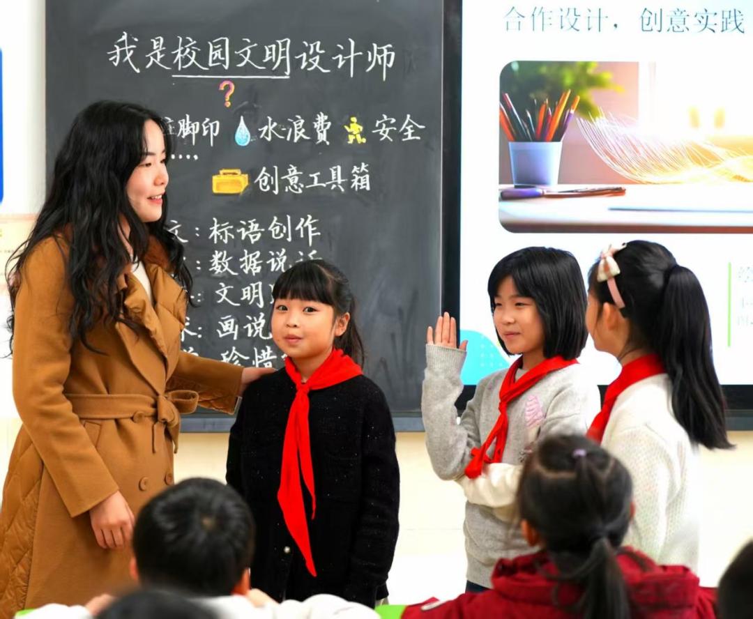 如今,走进盐城市解放路实验学校,门上的小手印、洗手池旁的节水贴画、饮水机边的数据海报、楼梯口的“小脚丫”指引随处可见。这些由学生亲手设计的作品,不仅美化了校园环境,更在无声中传递着文明理念与责任意识。更重要的是,在活动过程中,学生们像设计师一样思考,锻炼了实践创新能力;像研究者一样探索,培养了科学精神;像主人翁一样担当,涵养了责任与情怀,实现了知识学习与品格成长的双重收获。