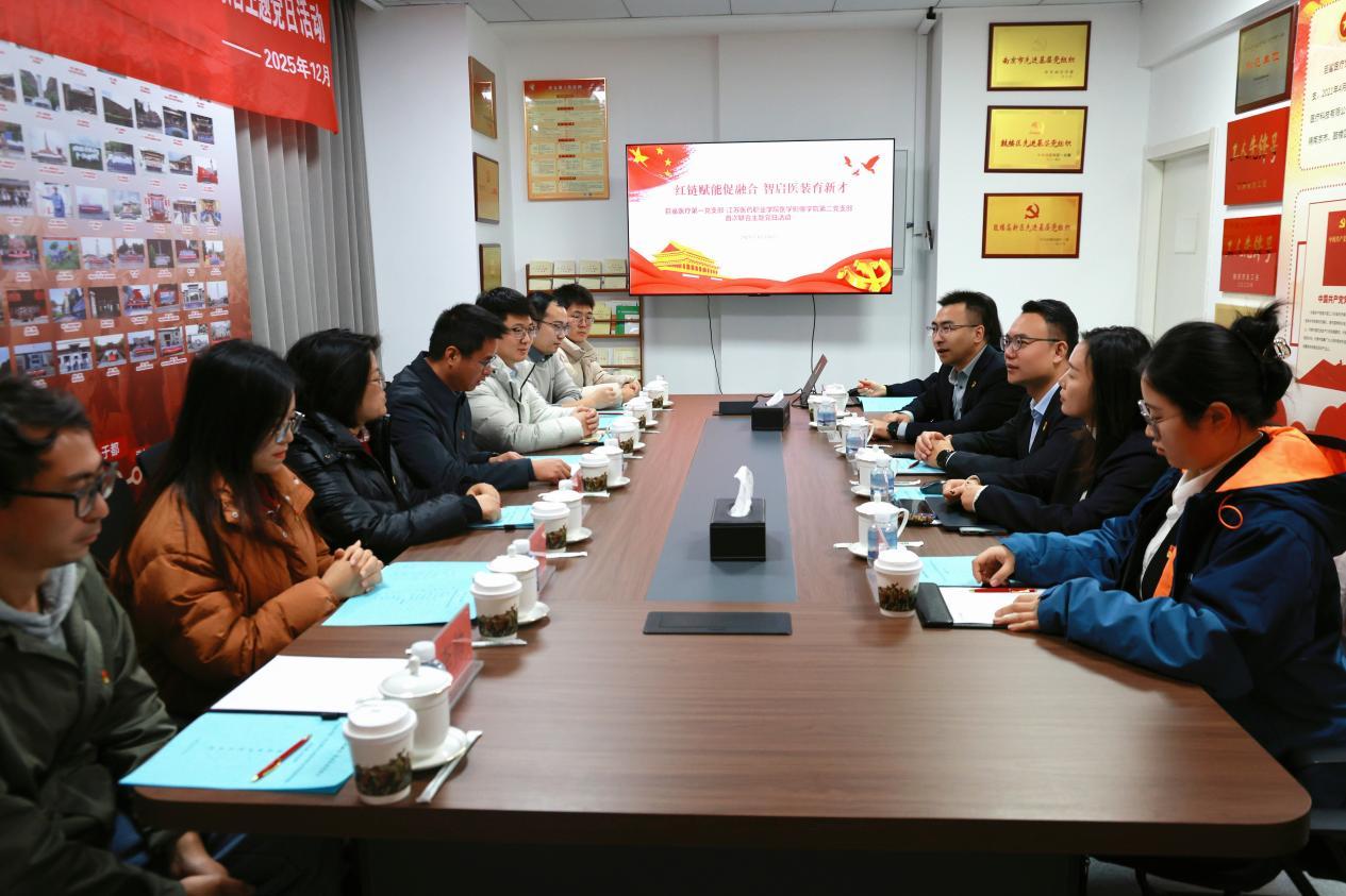 为深入贯彻落实省委组织部、省委教育工委关于“高校党组织对接产业链党组织”专项行动部署,积极响应我校“党旗领航医链聚势擎动健康”专场活动精神,推动党建与医药健康产业链深度融合,2025年12月18日,江苏医药职业学院医学影像学院第二党支部与南京巨鲨医疗科技有限公司第一党支部在南京联合开展“红链赋能促融合智启医装育新才”主题党日活动,以实际行动践行“组织链”精准对接“产业链”,迈出校企党建协同育人的坚实一步。