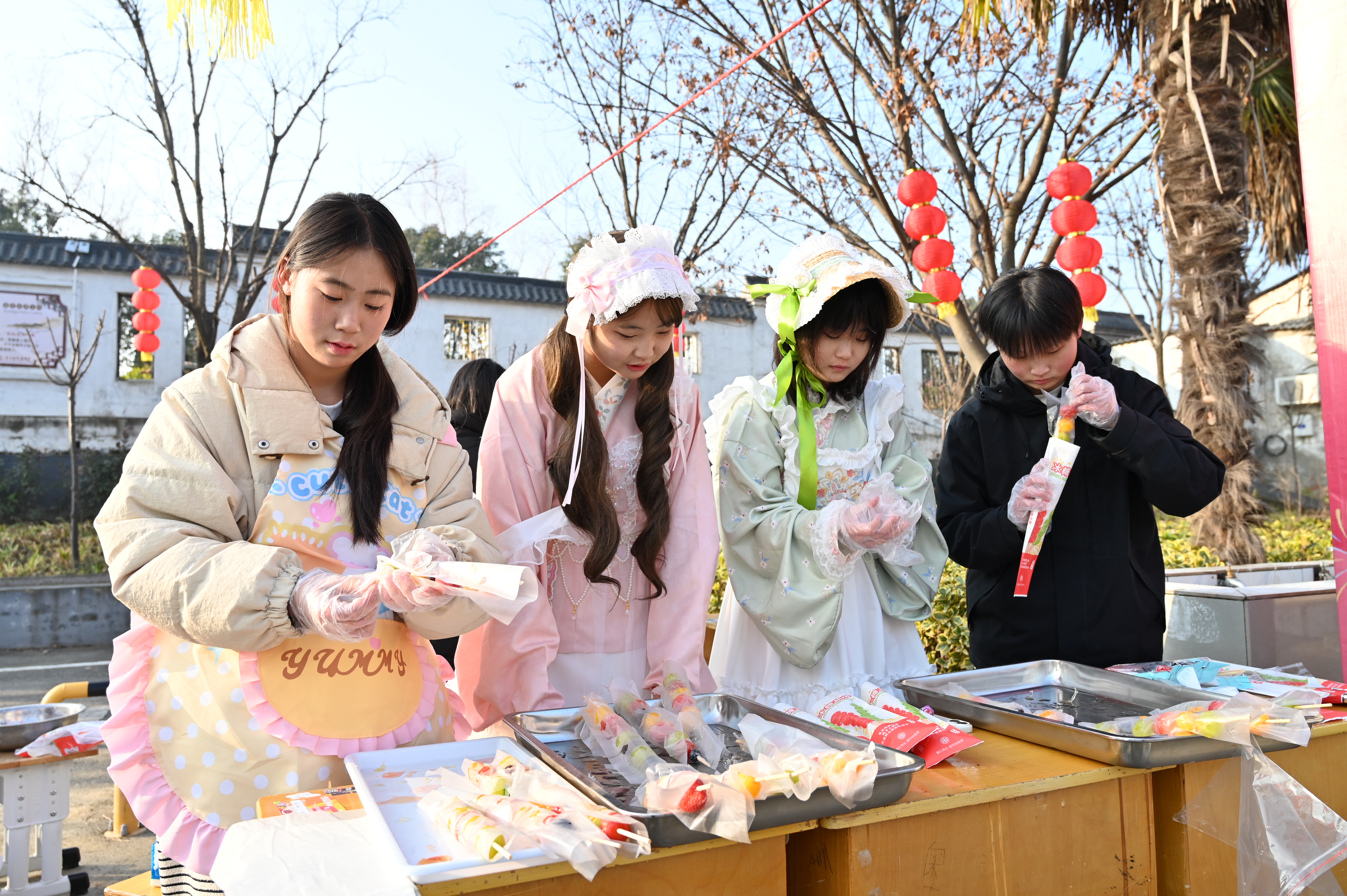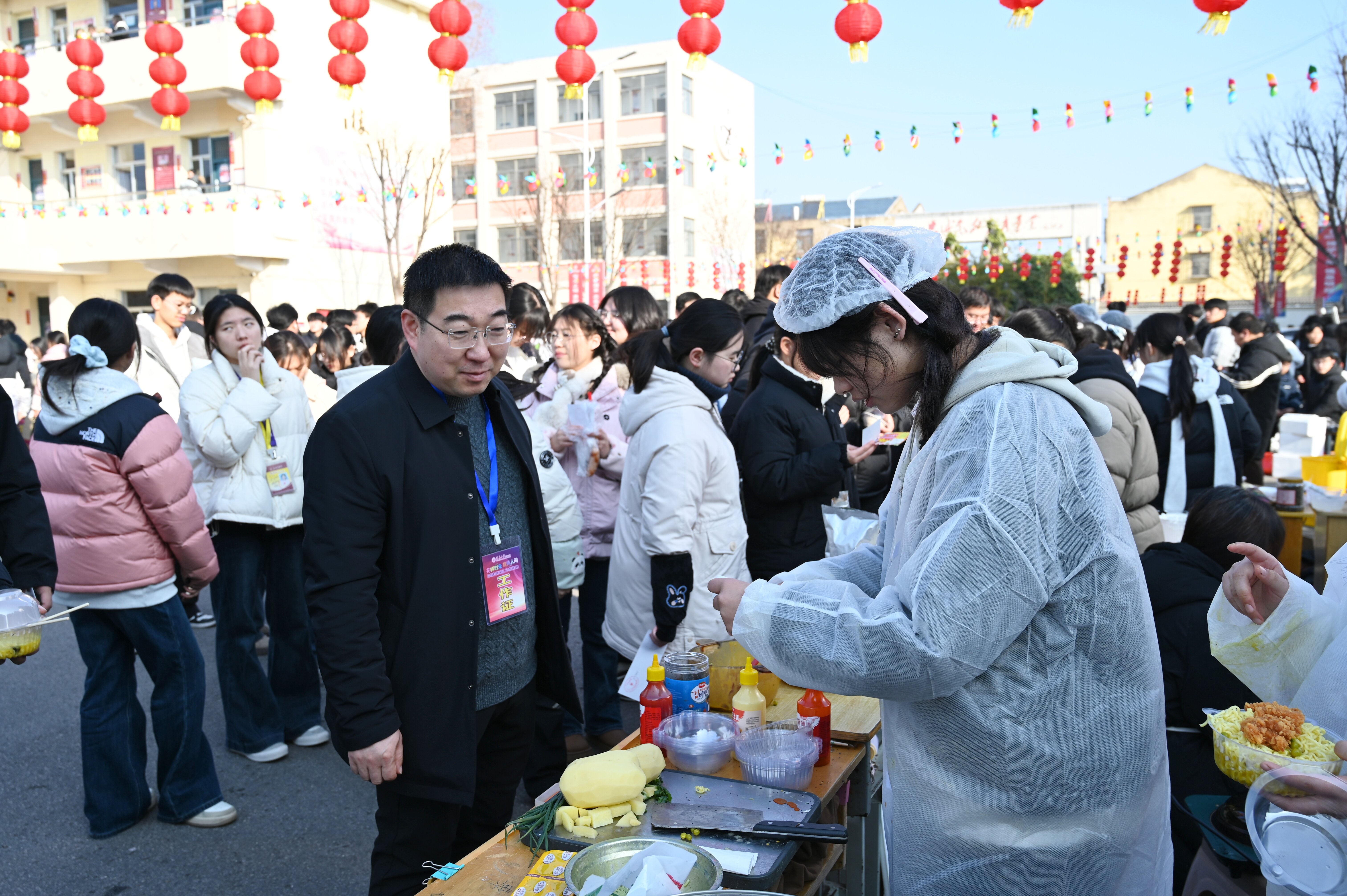 金黄酥脆的鸡米花、香辣入味的面条、饱含家乡风味的手工水饺、色彩斑斓的创意甜品等佳肴齐聚,锅勺碰撞间满是劳动的欢愉与创造的满足。高三2班汪浩的“五彩汤圆与馄饨摊”前人头攒动,自然色泽的汤圆与皮薄馅香的馄饨开售即售罄,他坦言:“从调馅到包制反复调试,食物是心意的载体。”高一7班班主任李玥看着忙碌中额角沁汗的学生,动容感慨这是“实实在在的成长”。