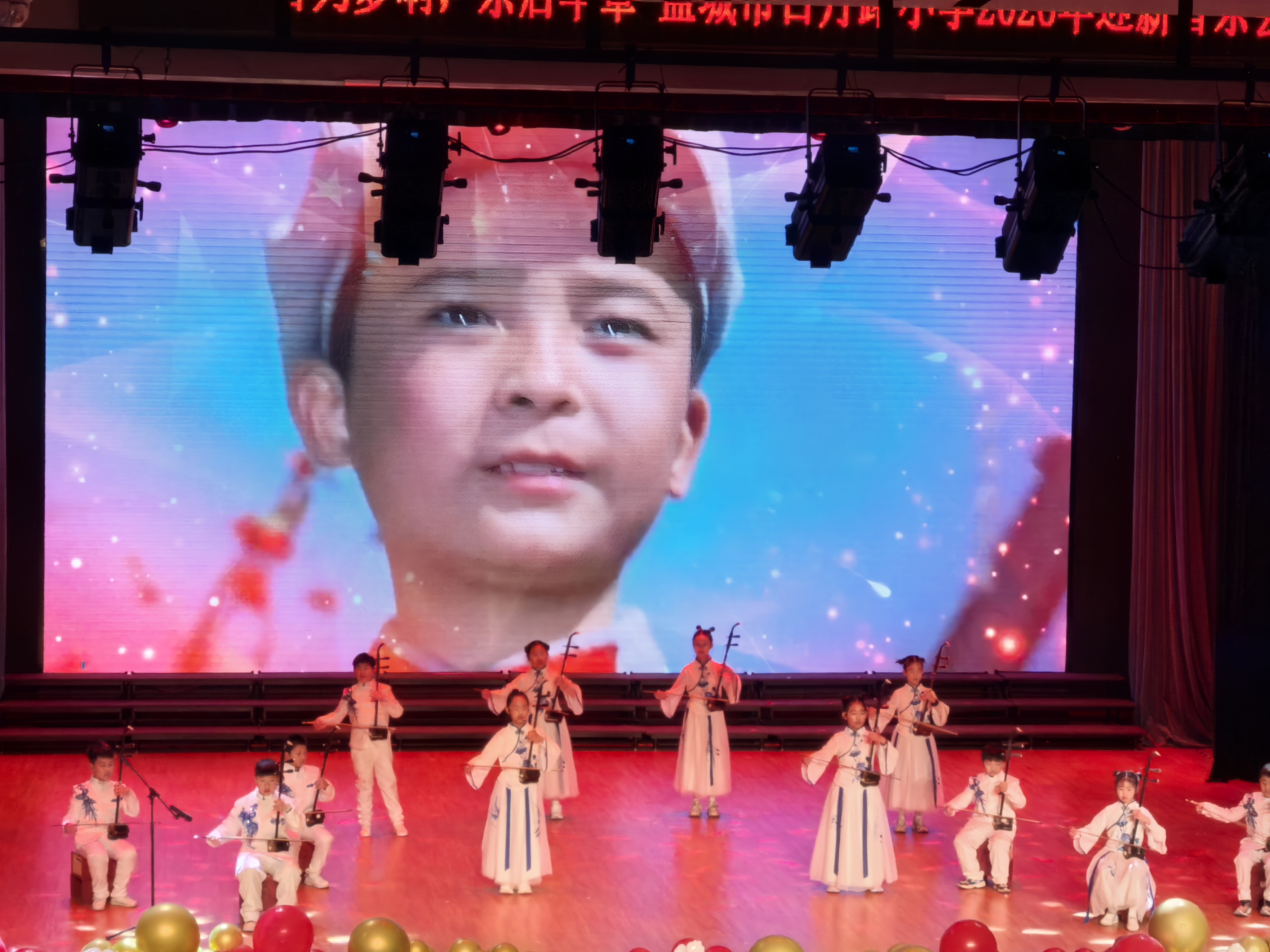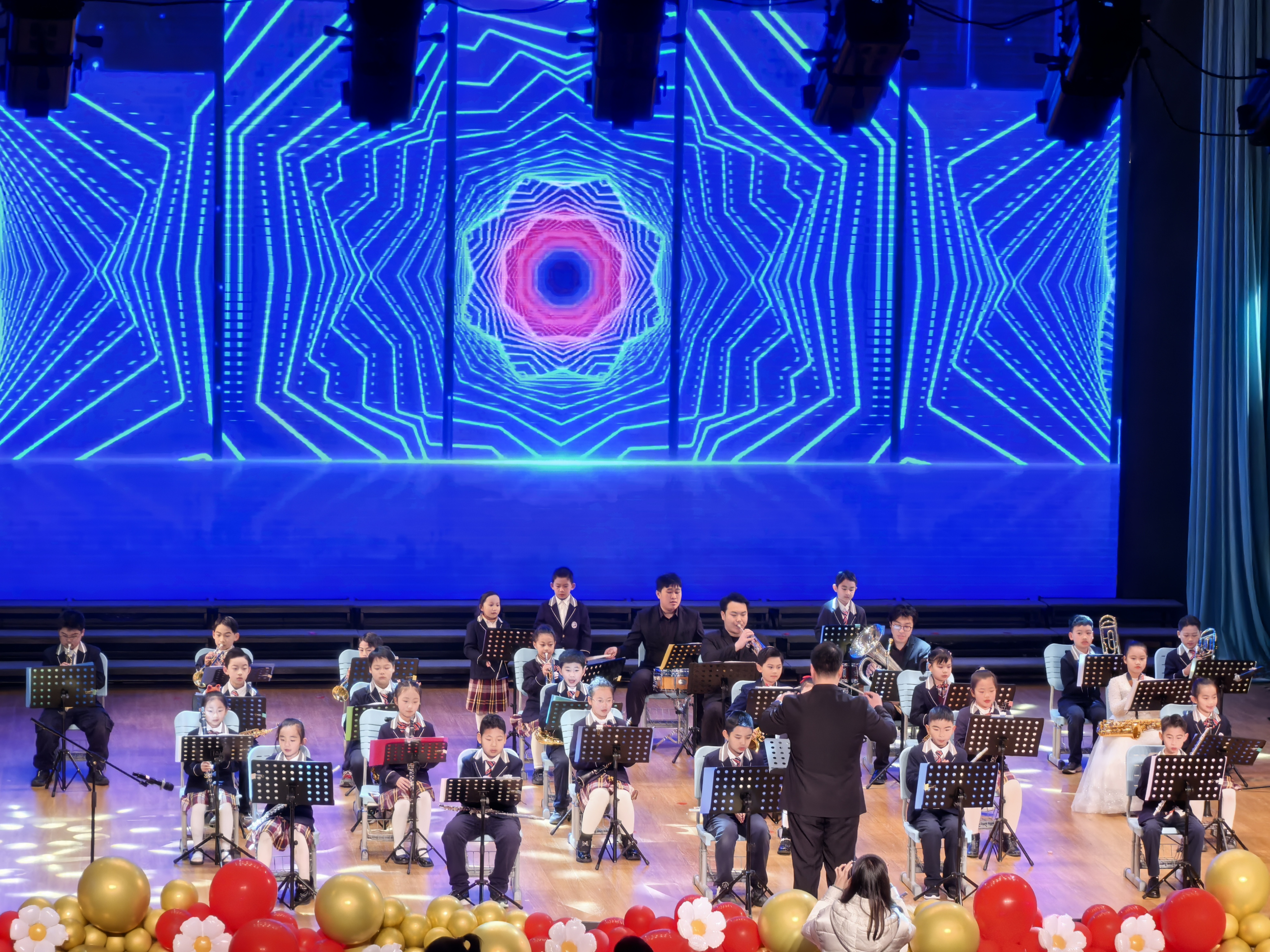 音乐会共有“雅乐和鸣 ”“ 童心独秀 ”“ 管乐飞扬 ”“ 少年欢腾”四大篇章。“雅乐和鸣”篇弦管既鸣、雅韵自生:二胡齐奏《红星歌》深情款款,奏出少年的赤诚与担当,唢呐独奏《正月十五闹雪灯》喜庆喧腾,大提琴齐奏《萱草花》《大鱼》则温情流淌,展现了学生对传统与经典音乐的深刻理解;“童心独秀”篇是个人技艺的精彩展示:钢琴独奏《夜莺在歌唱》灵动婉转,英文独唱《LetItGo》充满力量,独舞《群青》飘逸优美,轻盈的舞步,灵动的身姿,充分彰显了日月路小学学生的个性风采与艺术潜能;“管乐飞扬”篇将气势推向高潮:管乐团合奏的四首曲目,从《动力摇滚》的激昂到《星火进行曲》的雄壮,展现了团队的默契与力量,萨克斯齐奏《欢乐颂》则以熟悉的旋律引发了全场共鸣;“少年欢腾”篇是活力与家国情怀的集中体现:群舞《花儿那样红》绚丽绽放,街舞轮滑串烧《破局者》动感酷炫,最终,合唱《小美满》与《我的祖国》以温暖与豪迈交织的歌声,为音乐会画上圆满句点。